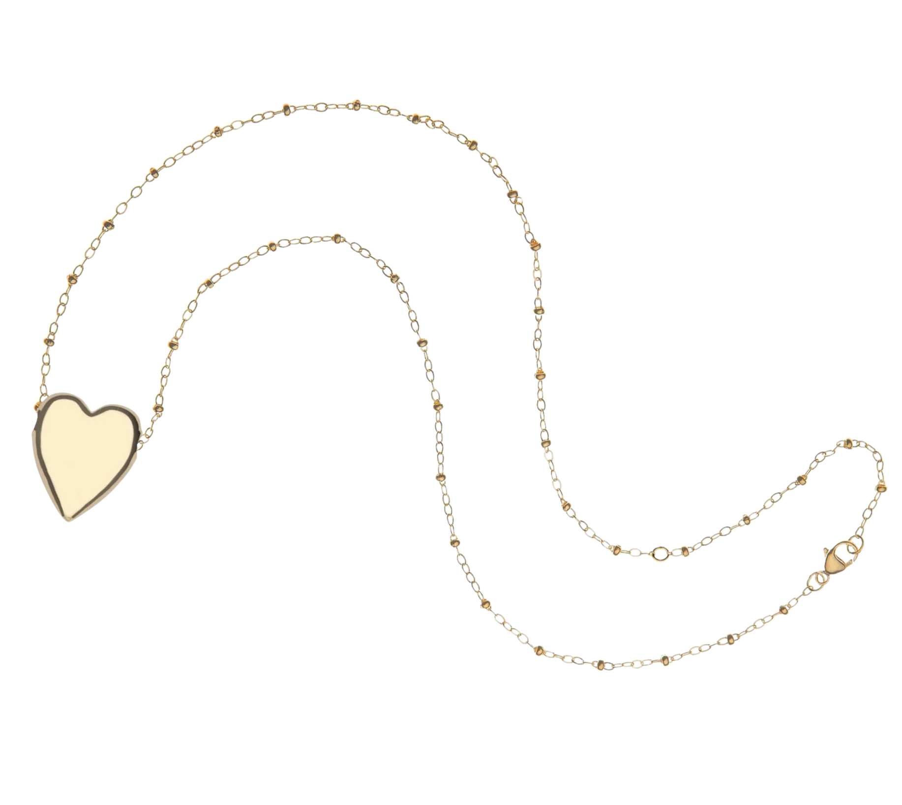 WE ARE OBSESSED. Obsessed with love. Obsessed with hearts. And this tender heart just makes our hearts feel FULL. Double-sided with a hollow interior, the chain runs directly through this heart for a unique look in your neckmess. Comes on your choice of our classic satellite chain or on a pop of pink with our new omega wire.