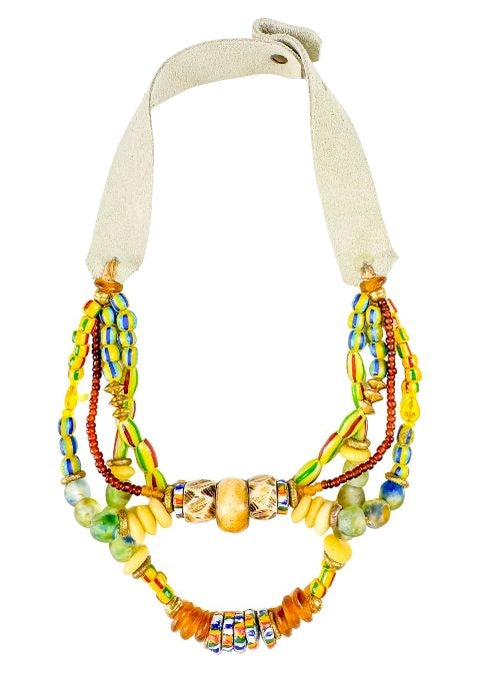 The Twine & Twig Luxe Classic Necklace is designed with globally sourced beads that are strung onto individual strands and tied together onto our signature branded suede straps. The necklace features two length options with a brass snap closure.