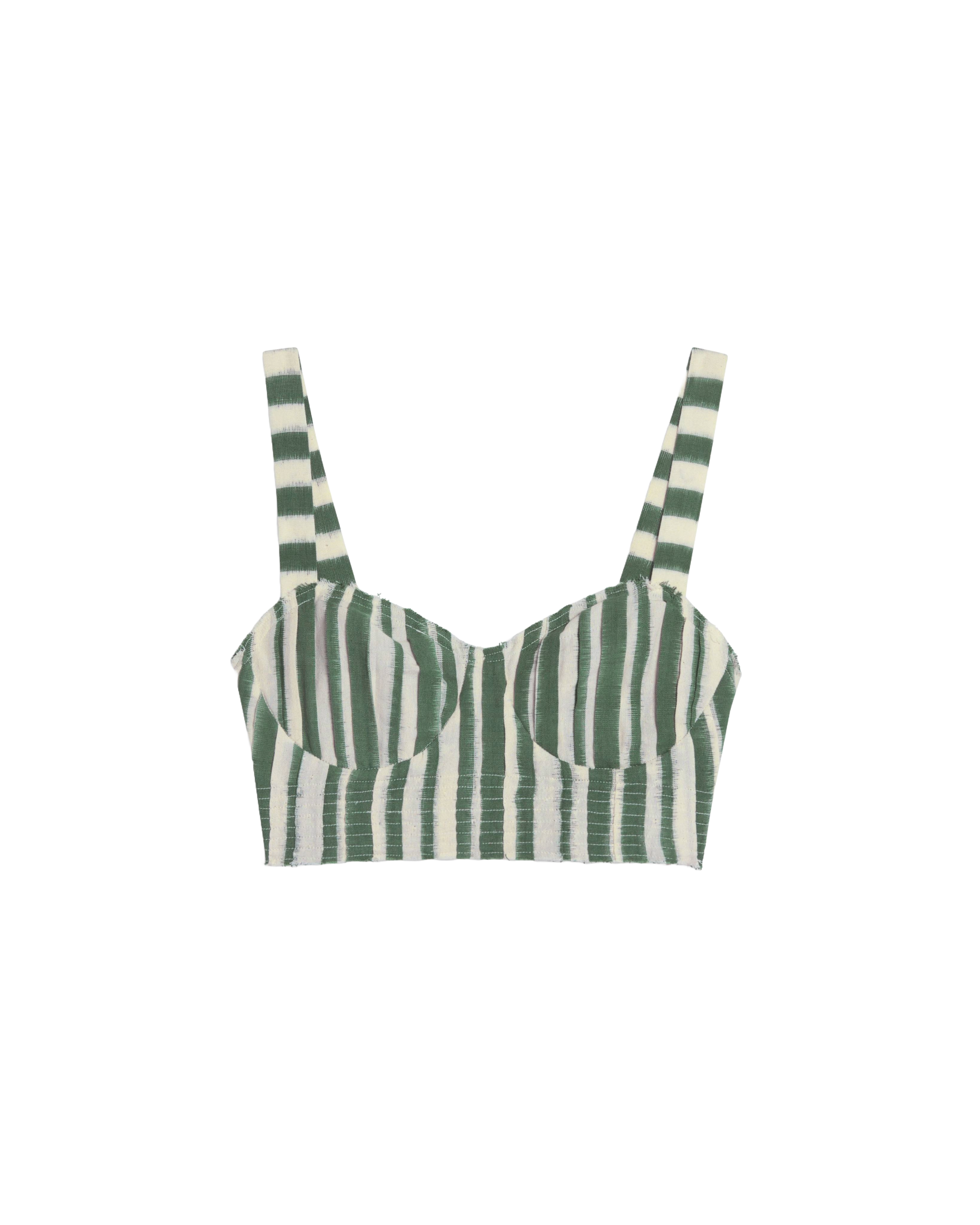 Inspired by classic corsetry, the Dalia Top is a beloved staple of Emporio Sirenuse. Featuring romantic pleats and an open hem, this underwired bustier provides a supportive fit that enhances any figure. Handwoven with previously dyed yarns following an ancient handloom technique, Ikat embodies the artisanal, time-honored approach of the Emporio Sirenuse aesthetic.