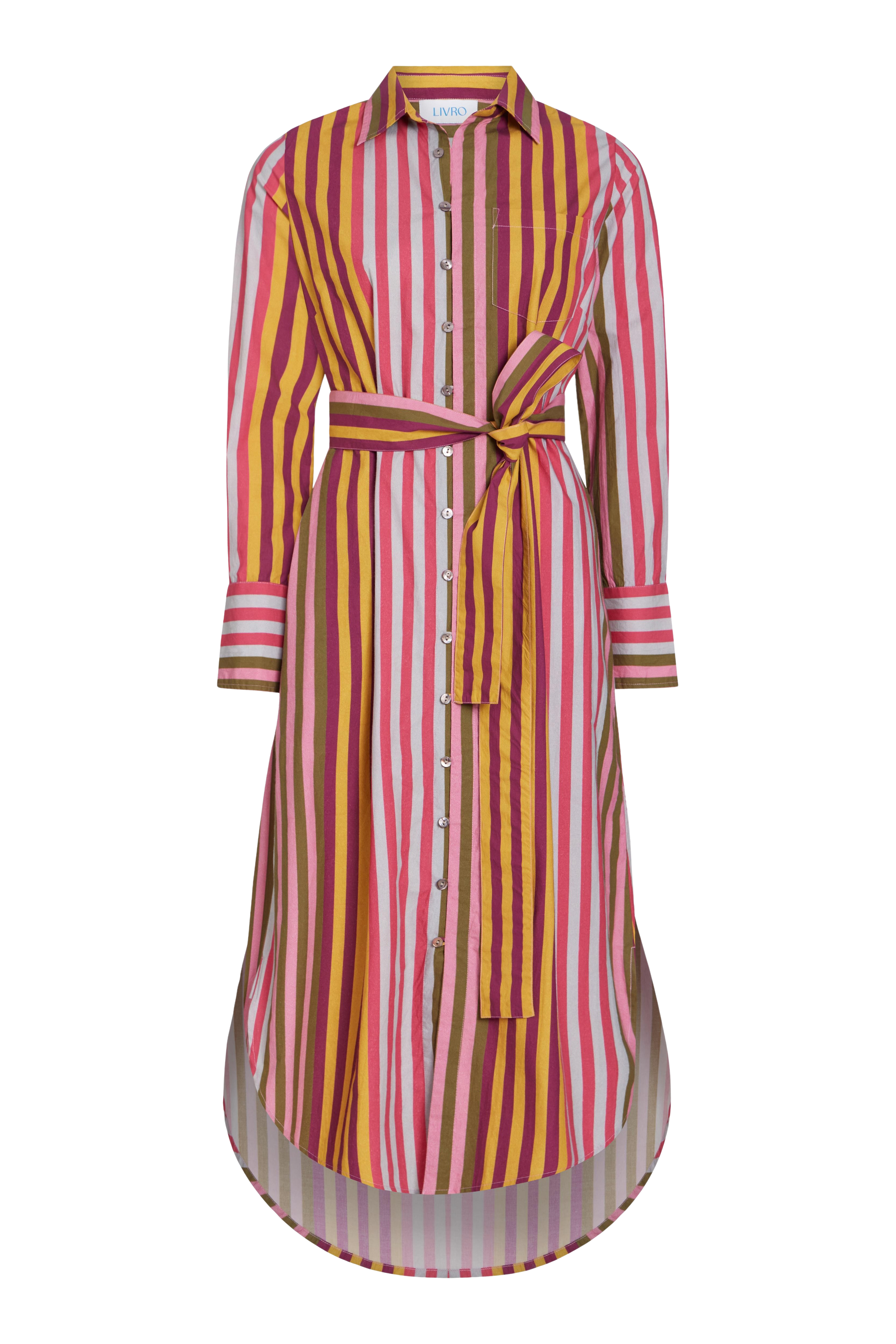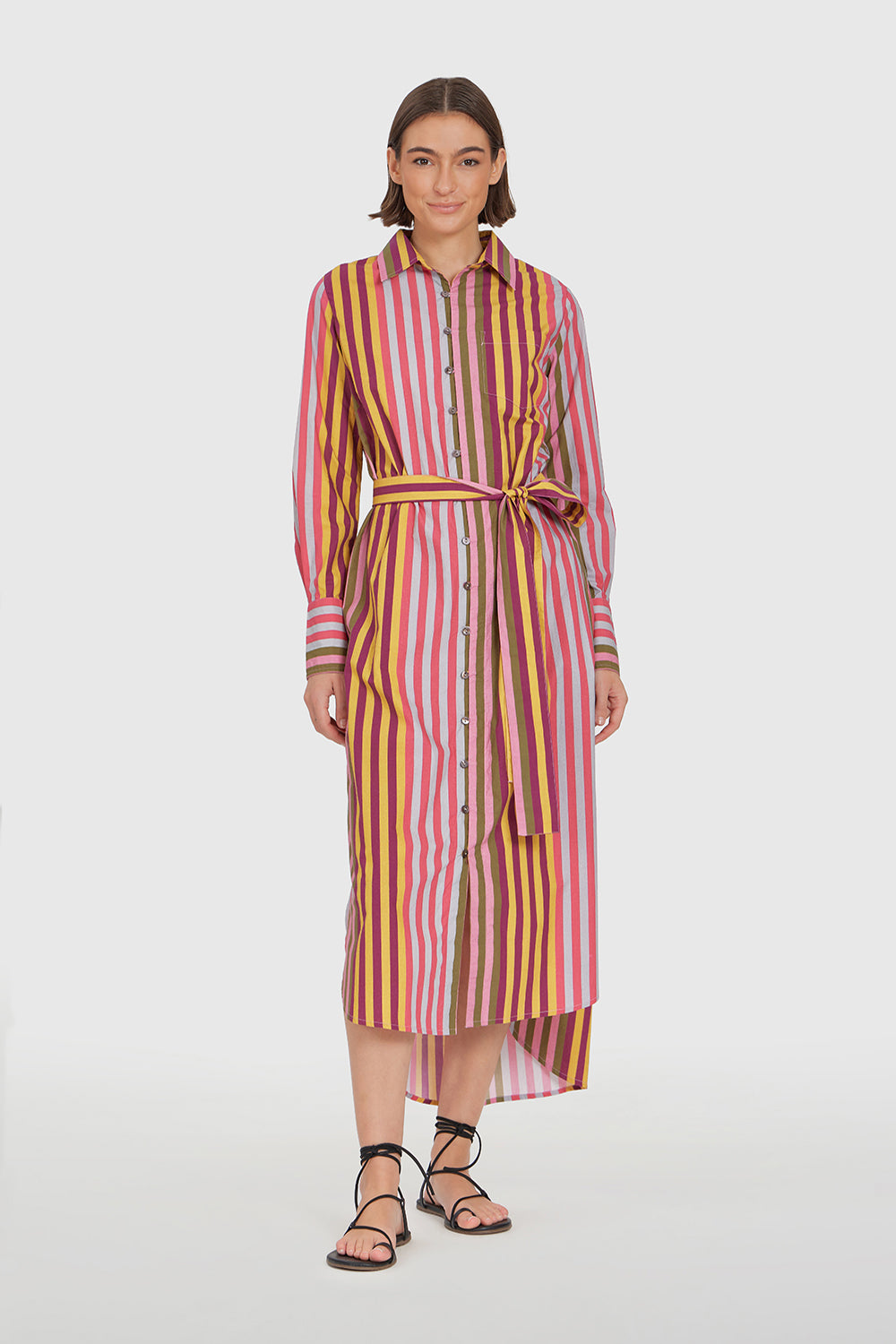 The Husband Shirt Dress delivers a laid-back polish with a splash of personality. The adjustable tie cinches the waist for a flattering shape, while the curved high-low hem keeps the vibe effortlessly relaxed. A modern nod to menswear with a feminine twist—perfect for sunny days and seaside escapes.