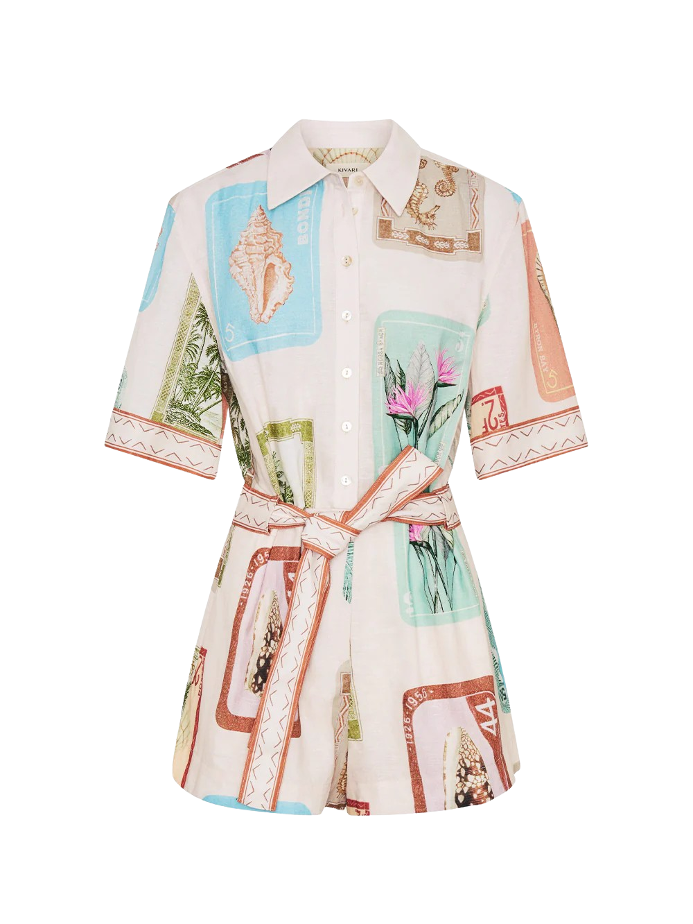Coastline is a vintage-inspired postcard print featuring coastal motifs in soft pastel tones on a soft neutral base. The Coastline Playsuit is designed in a relaxed silhouette with dropped shoulders and short sleeves, finished with a placement print. Featuring a button-through front and a removable waist tie, it offers a balance of ease and shape.
