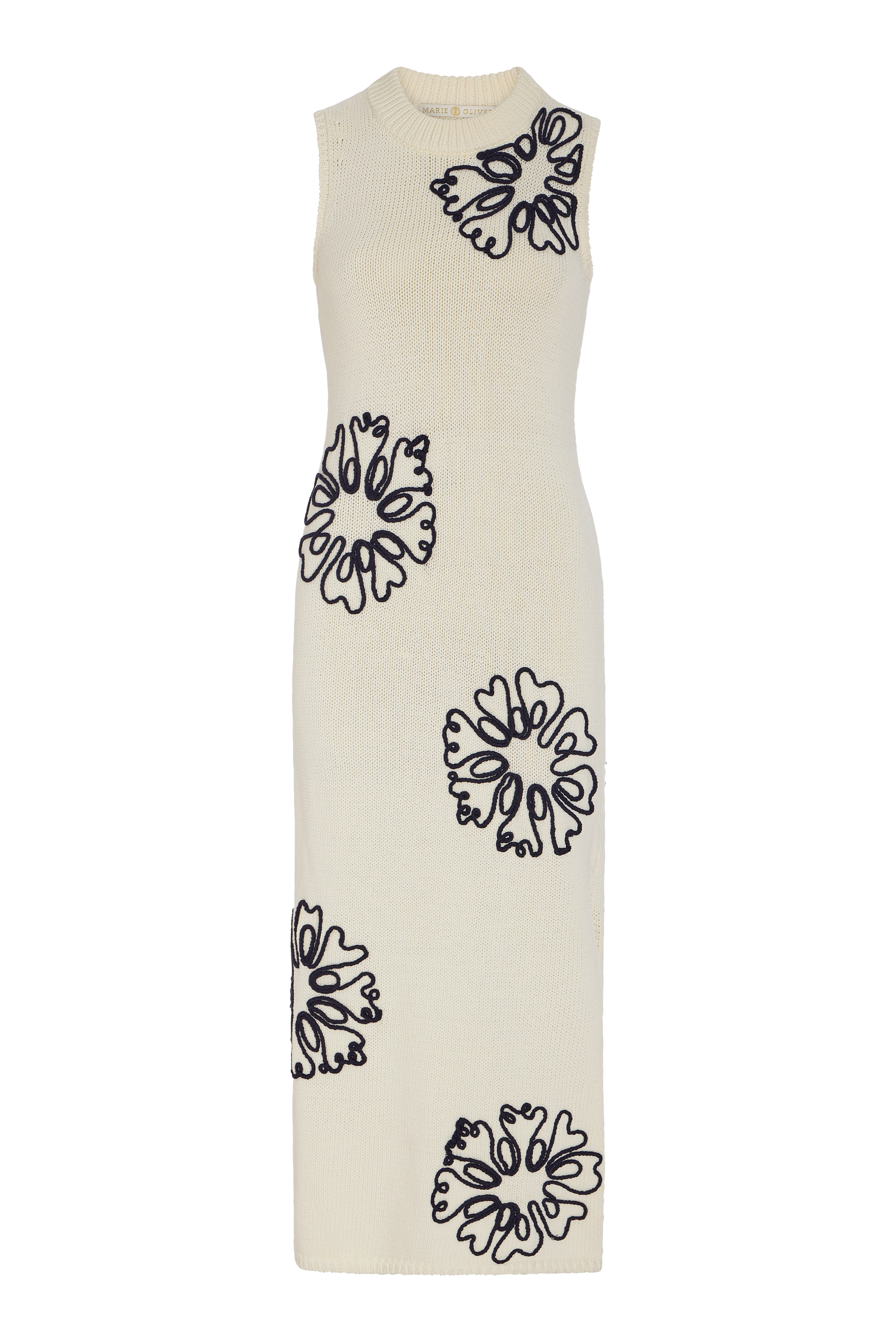 Patricia is made for spring getaways and lingering nights alike. The knit dress features oversized floral embroidery in timeless navy blue on a crisp white ground, and pairs beautifully with the matching Charlie cardigan when temperatures dip after sunset.