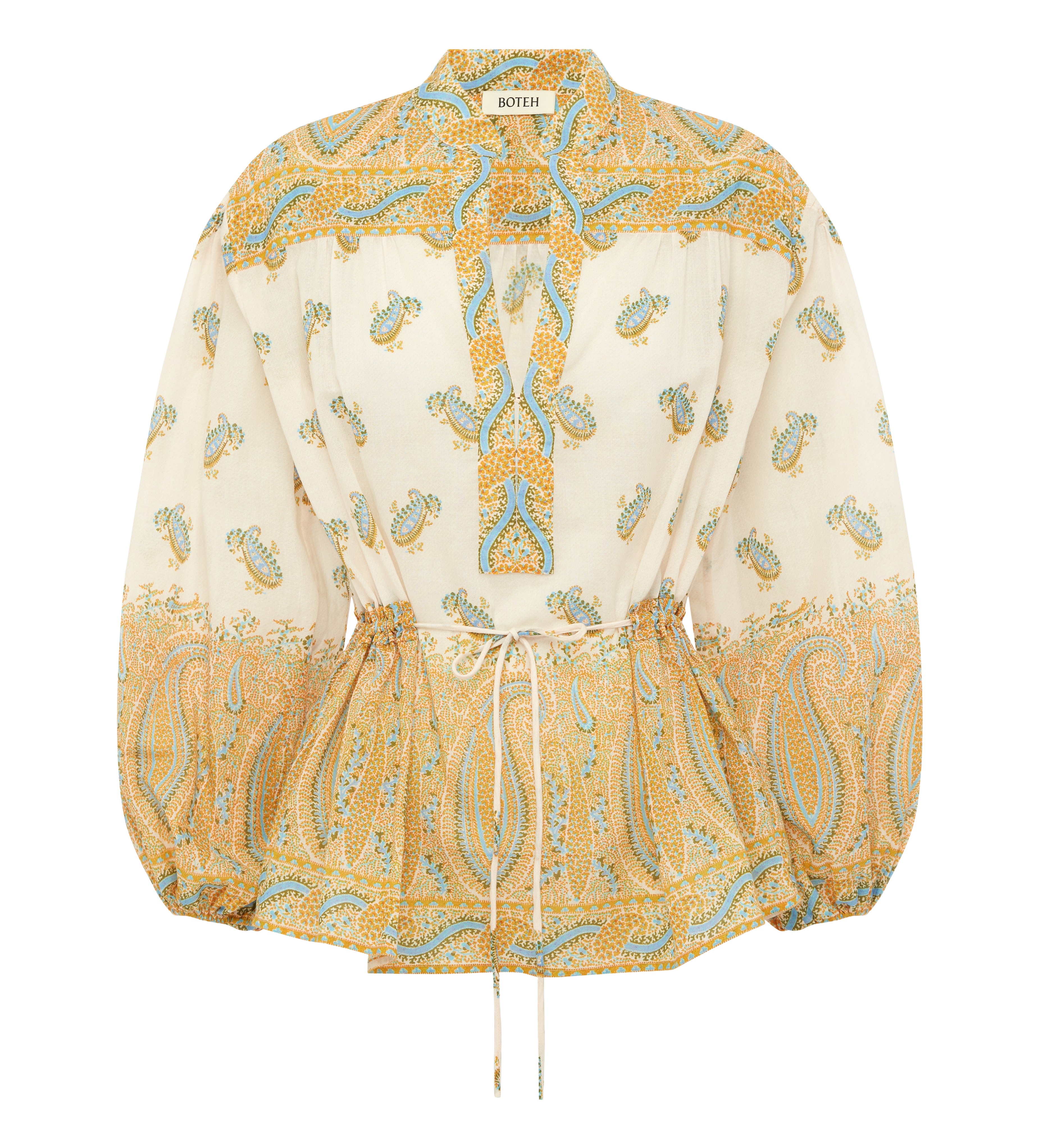 Jardin flourishes on a gardenia-white base, its airy florals and framed borders refined in ochre, jewel azure and olive across organic voile and linen layers.