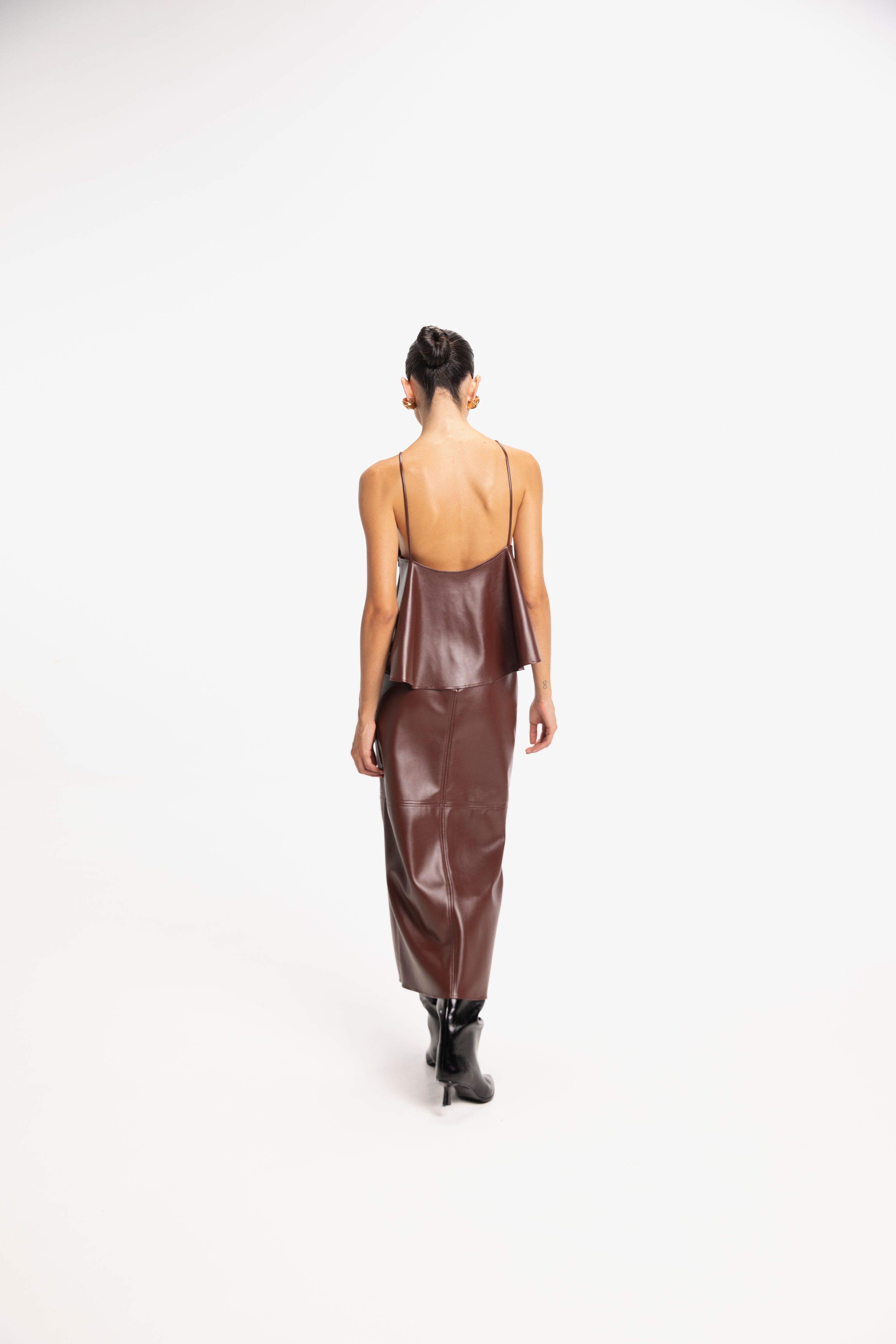 Sleeveless faux leather triangle top featuring a flared peplum.