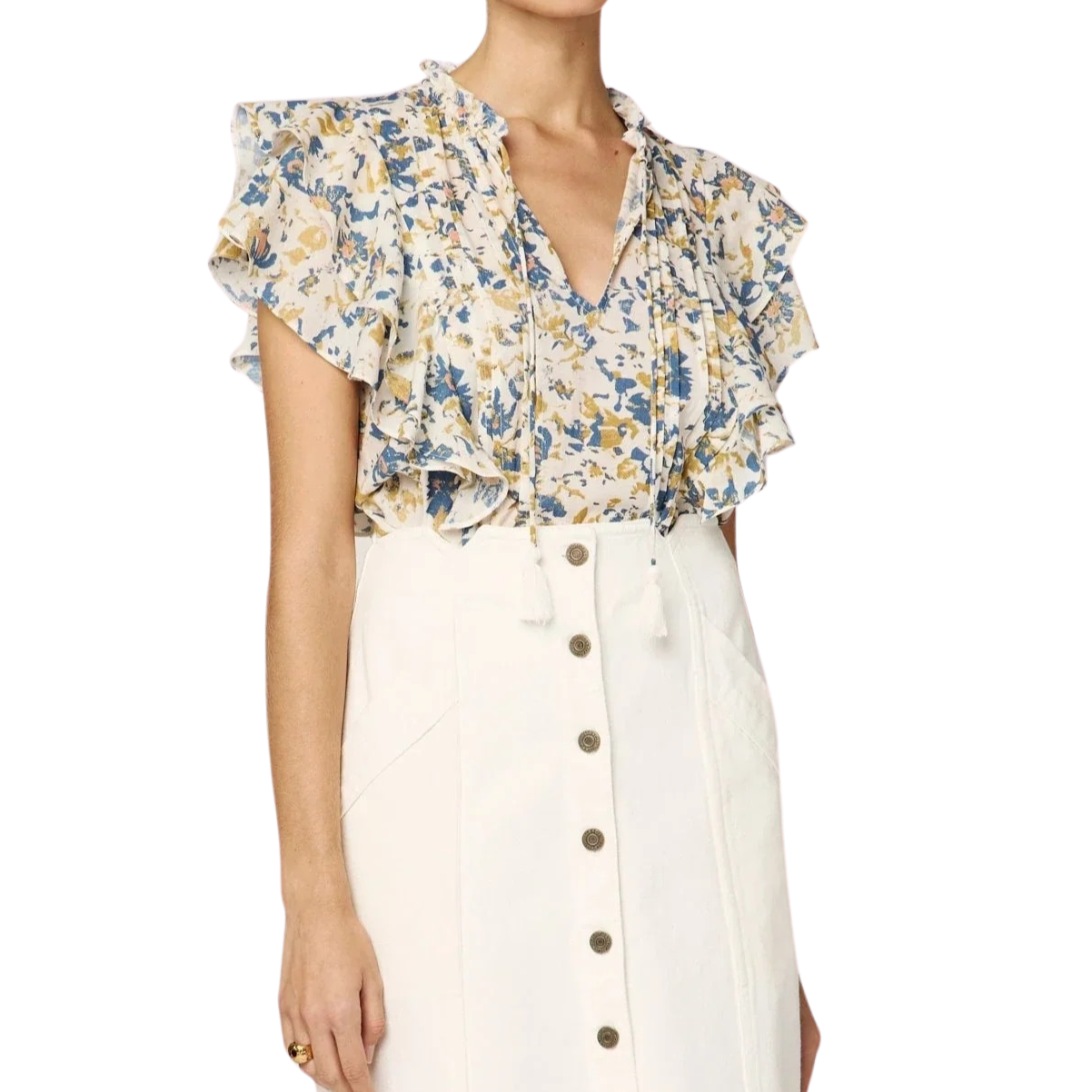 Ethically handmade in India, the Arista Blouse is effortlessly elegant in a hand-printed floral design. Featuring flutter sleeves, a soft ruffle at the neckline, and a delicate tie detail, this slip-on style brings romantic movement and ease. Pair it with high-rise denim or a midi skirt for a polished everyday look.