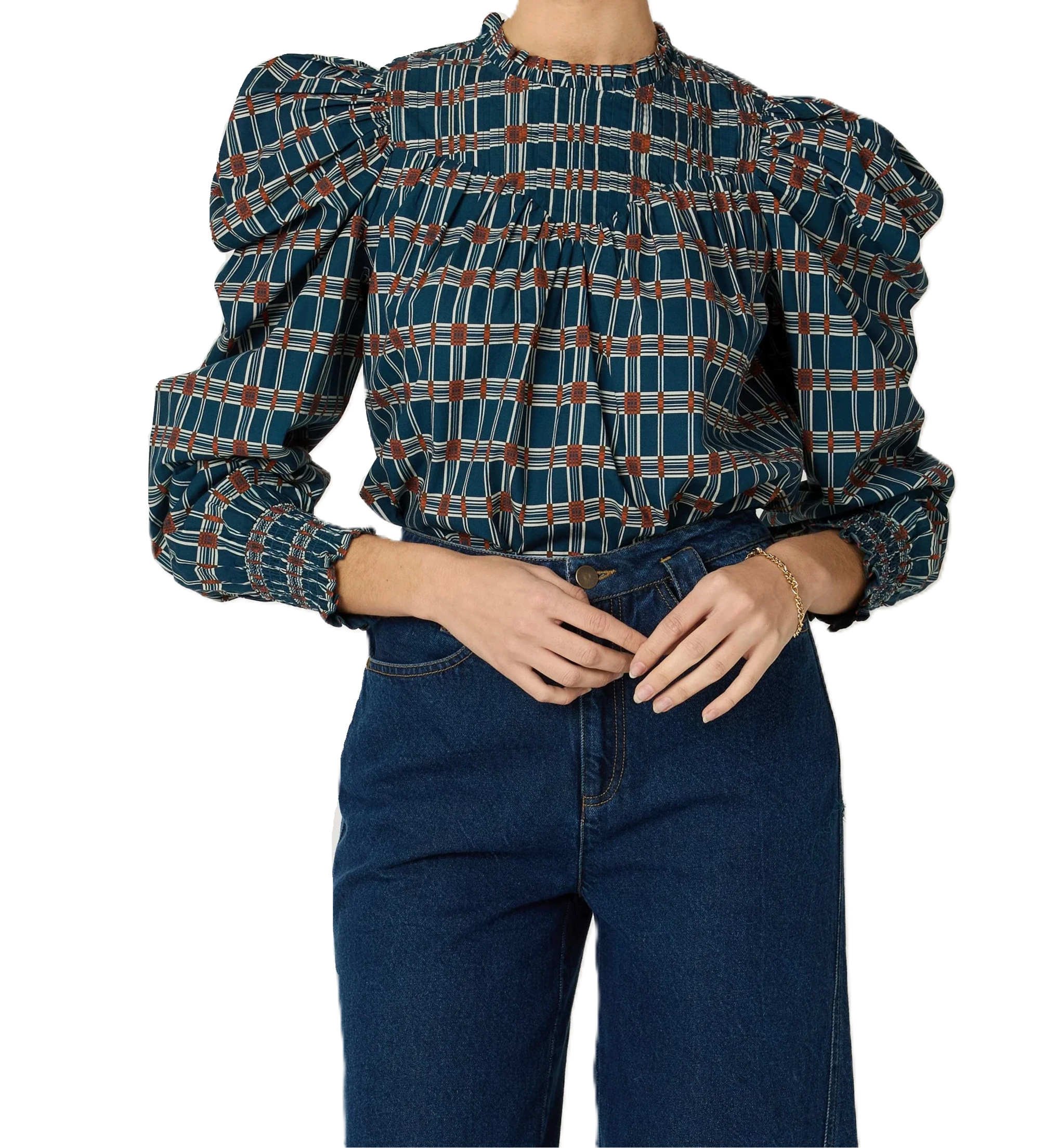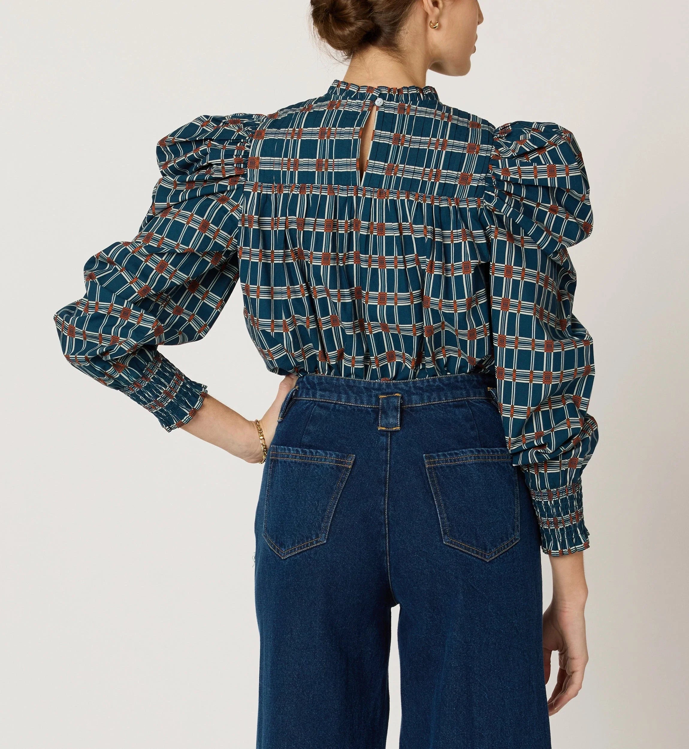 - Puffed bishop sleeve with a smocked cuff