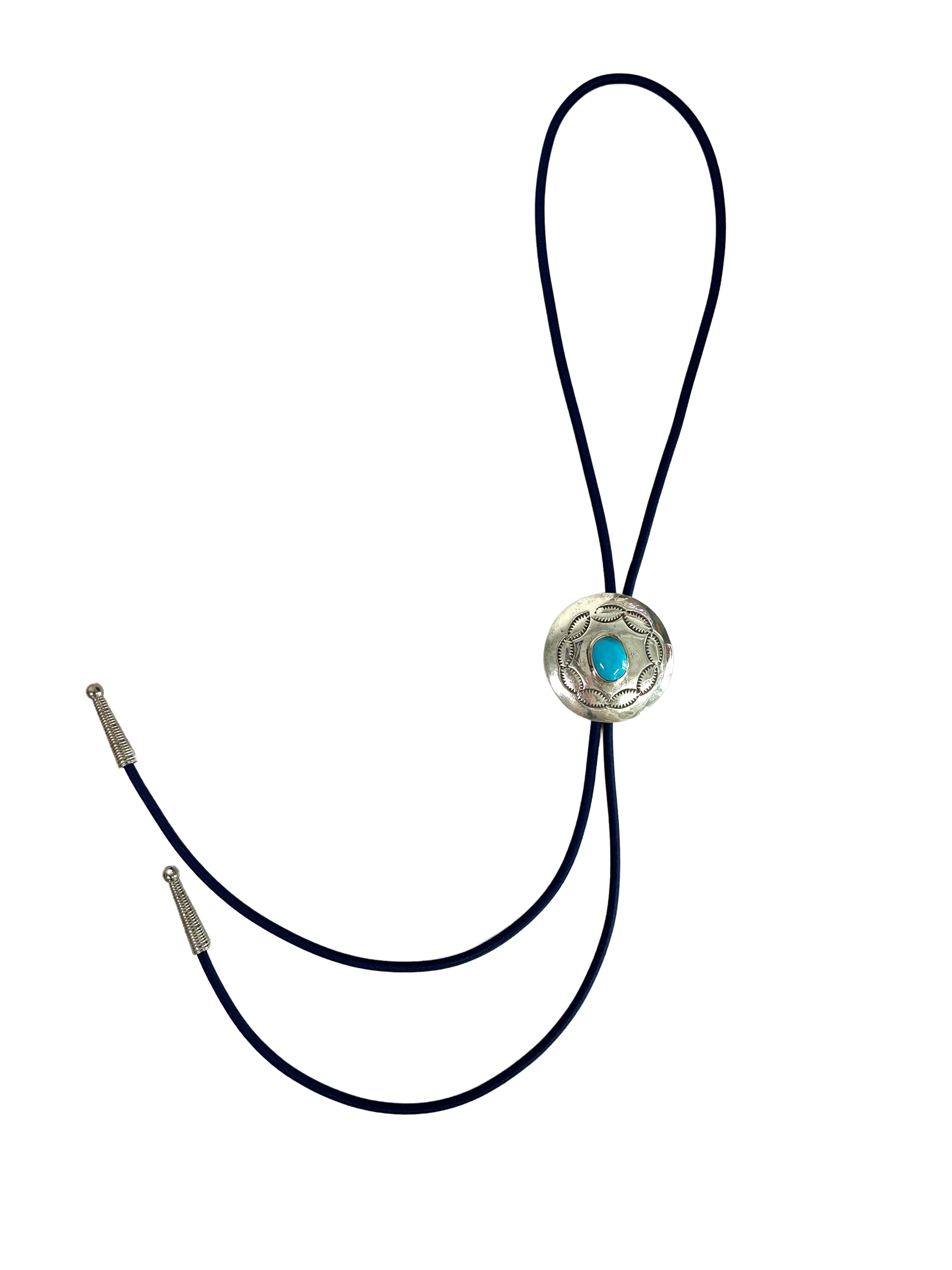 Sterling silver and genuine turquoise bolo. Cord measures approximately 34" long with sterling silver tips. Cord is interchangeable. Because each piece is truly one of a kind, the turquoise stone may vary slightly in veining but consistently the same color turquoise.