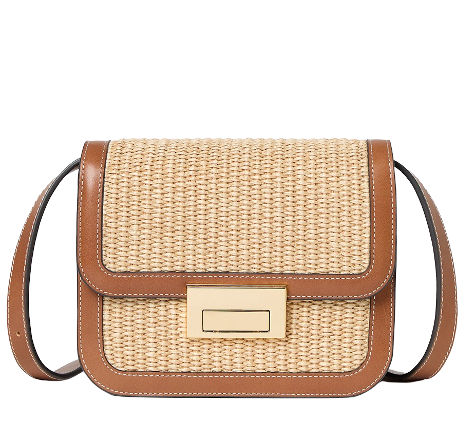 Crossbody in woven natural cacao. Features a tonal strap, flap design, push lock closure, full lining, and gold stamped logo.