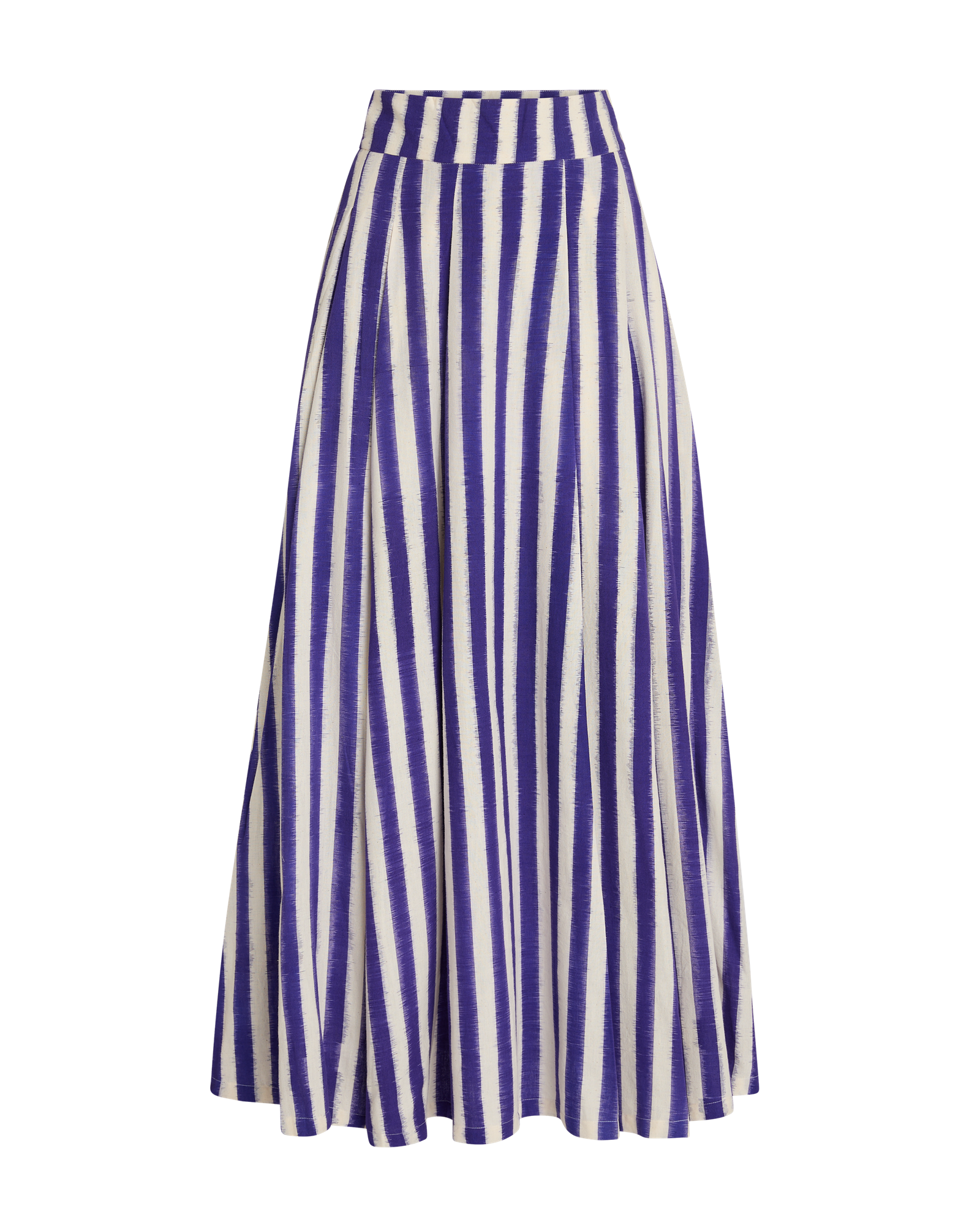 Featuring a wide, comfortable waistband, the Flaminia Skirt is a beloved breezy A-line silhouette crafted using the traditional Ikat technique, which involves dyeing threads before weaving to create one-of-a-kind striped patterns.