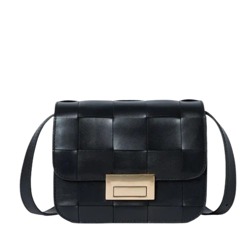 Crossbody in black wide woven vachetta leather. Features a tonal strap, flap design, push lock closure, full lining, and gold stamped logo.