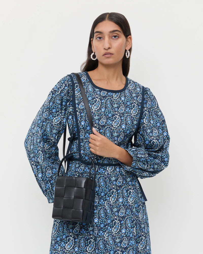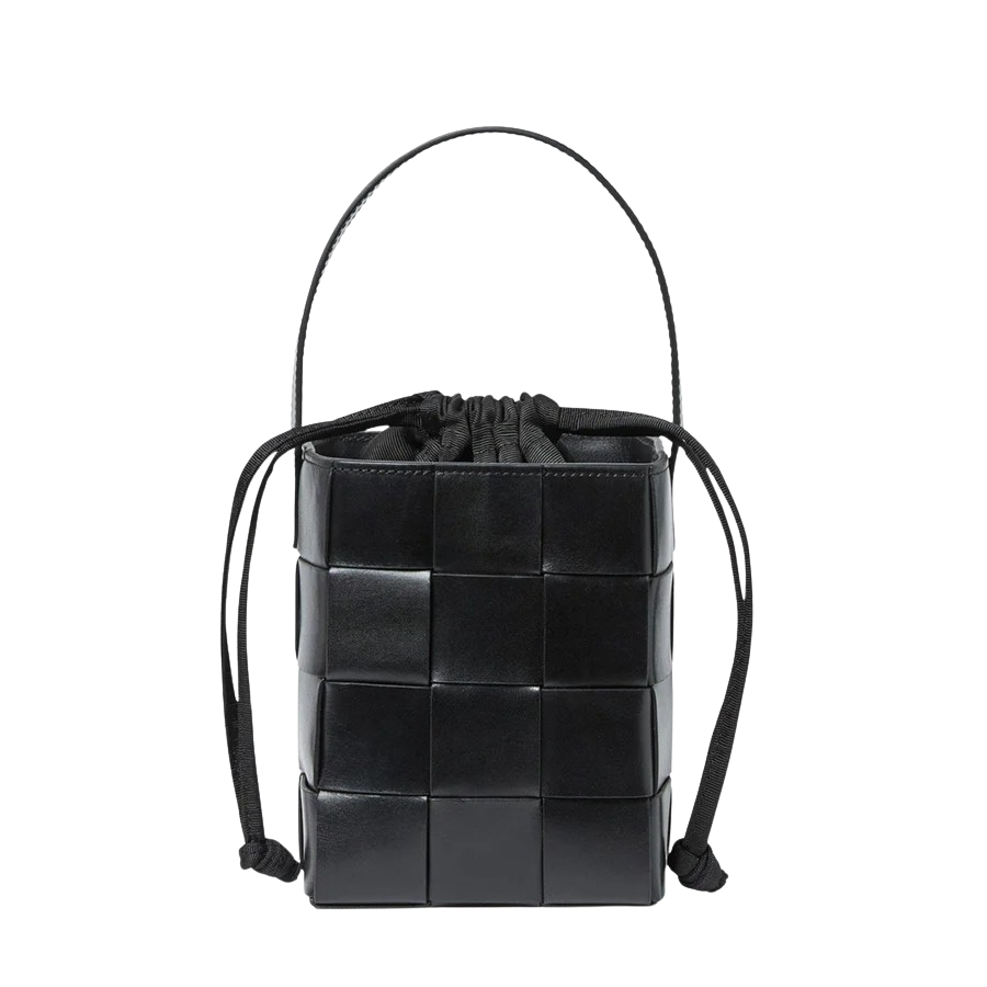 Small bucket bag in black wide woven vachetta leather. Features a vachetta leather strap, drawstring closure, and full lining.