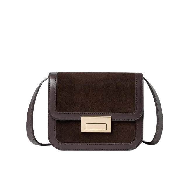 Crossbody in brown suede and vachetta leather. Features an adjustable strap, flap design, push lock closure, full lining, and gold stamped logo.