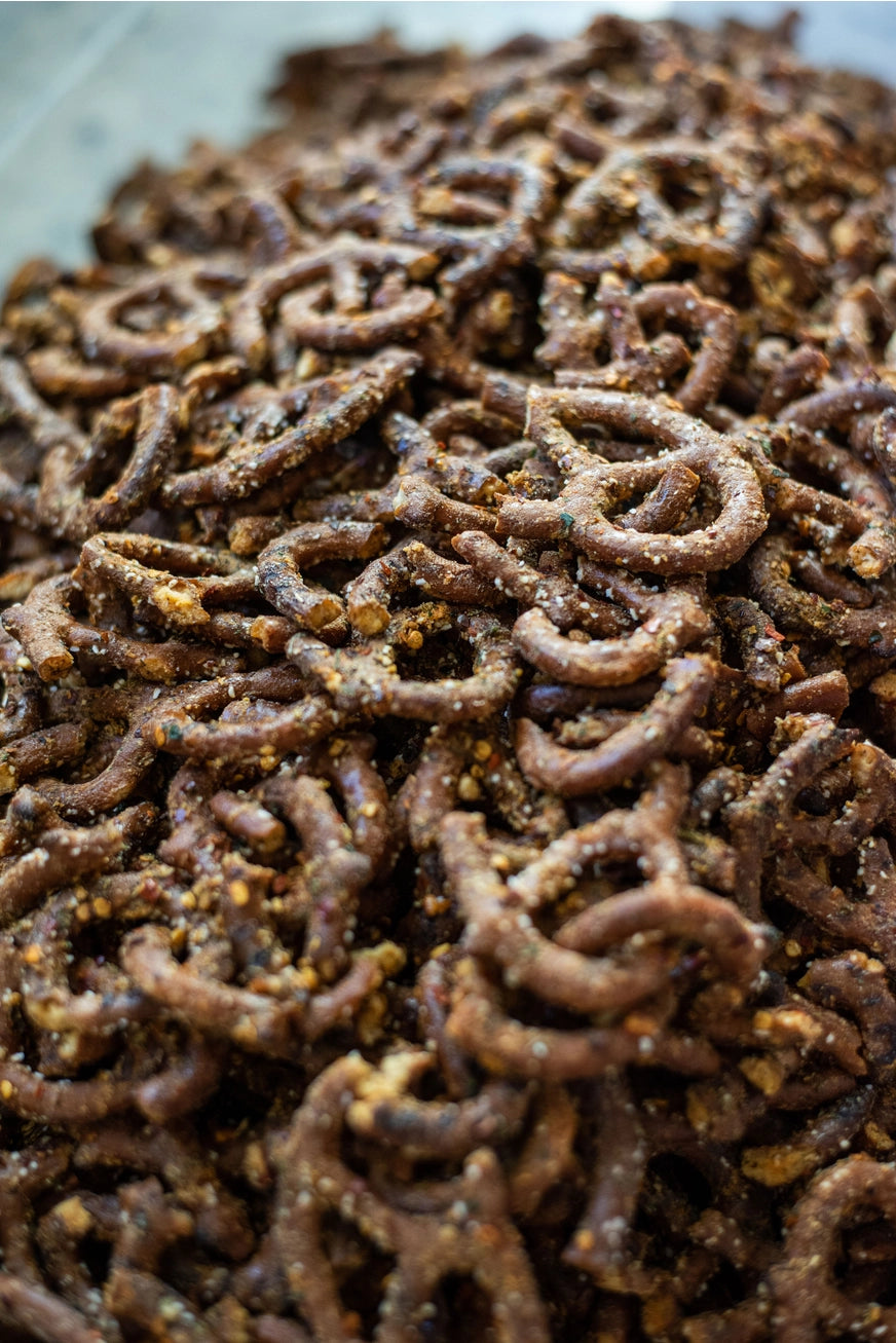 • Ingredients: Pretzels (wheat flour, salt, vegetable oil (corn oil, sunflower oil, canola oil and/or palm oil), malt syrup (derived from corn and malted barley), yeast, citric acid, lactic acid, baking soda), canola oil, crushed red pepper flakes, cajun seasoning (garlic, paprika, oregano, red pepper, salt, and onion, paprika), buttermilk powder (buttermilk solids (buttermilk solids and whey solids), garlic powder, onion powder, parsley, dill weed.
