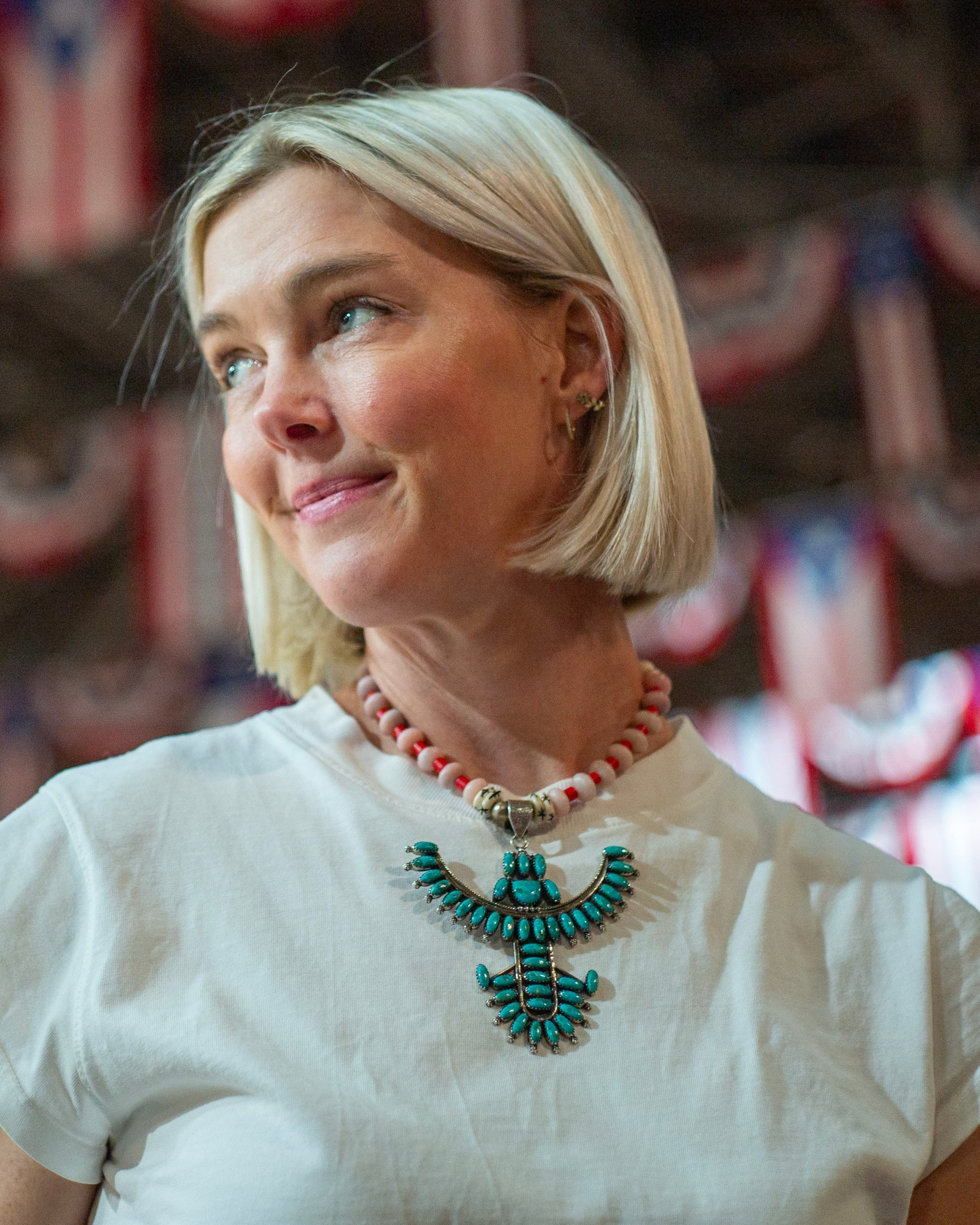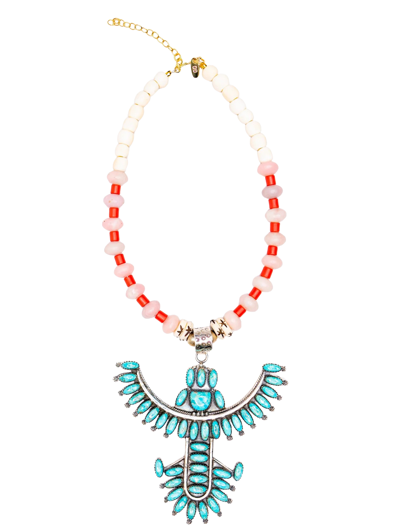 Sterling silver and genuine Sonoran turquoise eagle pendant with pink opal and African spacer beads. Measures approximately 15" with 2" extender. Eagle measures 4.5" wide by 3.5" tall.