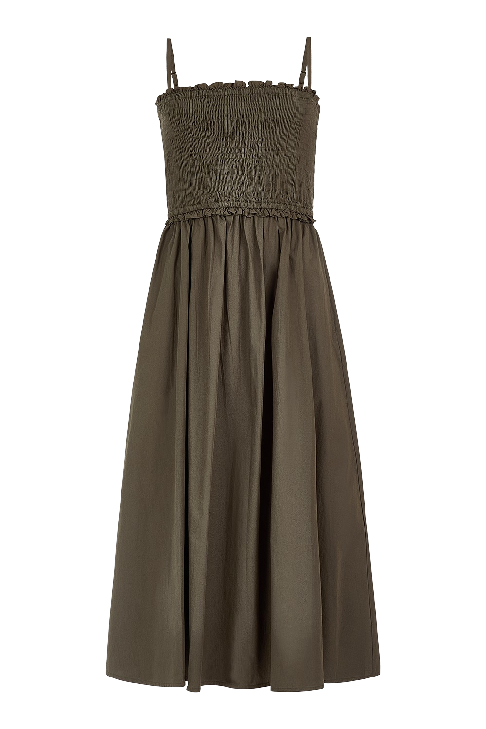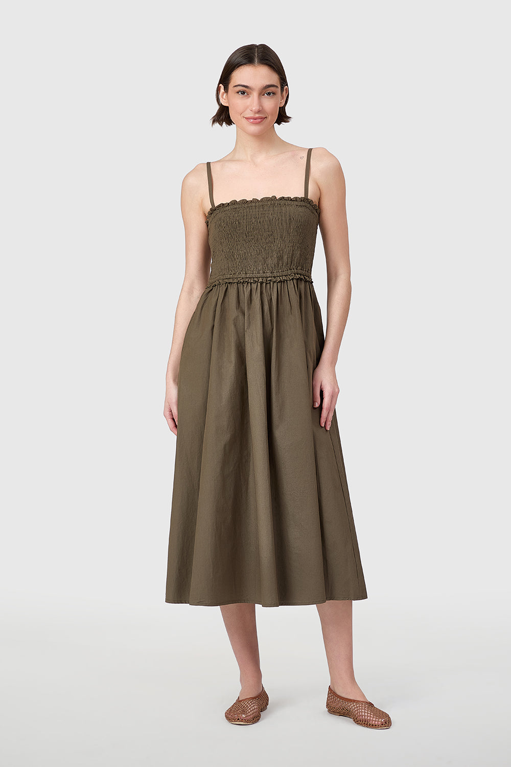 The Smocked Dress features a breezy, feminine silhouette with a smocked bodice and flowy A-line skirt. Designed with delicate, adjustable spaghetti straps, it offers a flattering, form-fitting top that gives way to a relaxed, mid-length skirt. The structured smocking enhances comfort and shape, while the lightweight fabric allows for effortless movement. It's the perfect warm-weather staple—easy to wear, packable for travel, and chic from day to night.