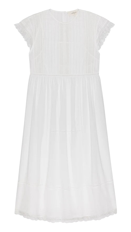 The Sonnet Dress is inspired by mid-19th century Victorian keepsakes, reimagined in airy cotton slub with fine lace and pintuck details. The silhouette is easy, with a crew neckline, peaked cap sleeves, and a defined waist that falls into a full skirt at the lower calf. Finished with a simple button placket at the back and accompanied by a separate cotton slip.