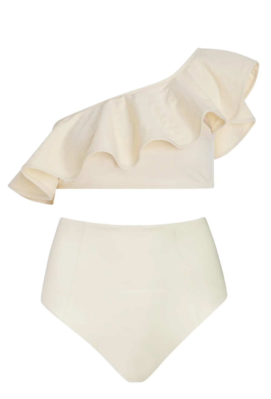 Sold as a set, the Doris and Micha bikini combines retro-inspired glamour with modern construction. The Doris top features a classic one-shoulder silhouette accented by a dramatic trapunto-stitched structured ruffle, creating a statement look with an elegant, feminine feel. Paired with the Micha bottom, the set channels an old-world aesthetic while delivering a supportive and flattering fit designed for all-day wear.