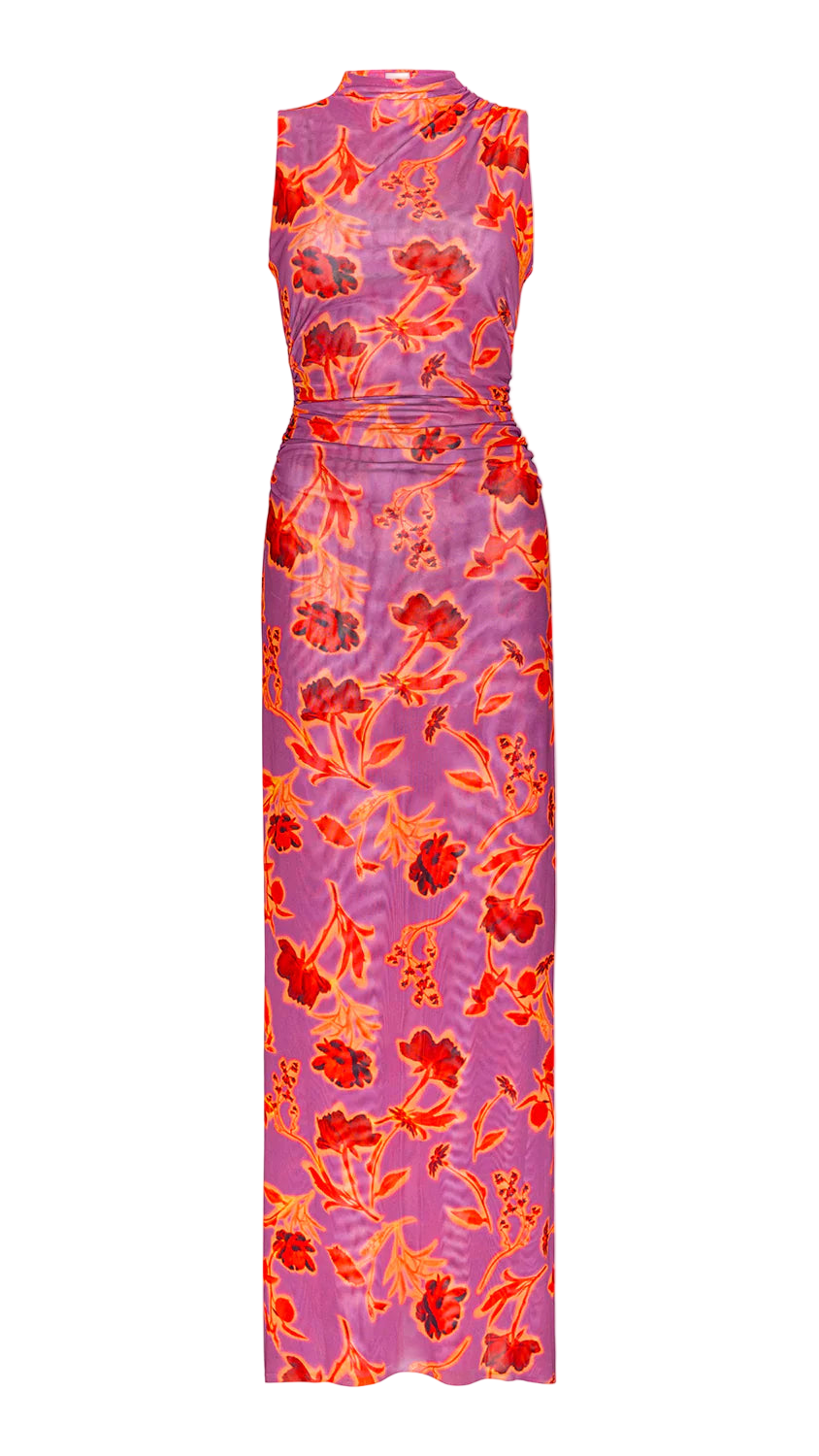 Stun this season and beyond in our new Athena dress, cut from an electric Lucent Flora printed mesh. This curve-hugging maxi style features a high neckline and ruching at the waist for a flattering fit. Pullover style with button details at the shoulder. Pair with strappy heels for your next event.