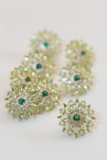 Inspired by the lush, layered petals of a dahlia in full bloom, these 1" radiant statement studs bring a fresh, romantic touch to any spring look. Faceted crystal petals shimmer in soft, luminous tones, surrounding a rich center stone for a dimensional floral silhouette that feels joyful and bold. Perfect for spring events, brunch dates, and adding a bright pop to your seasonal wardrobe.