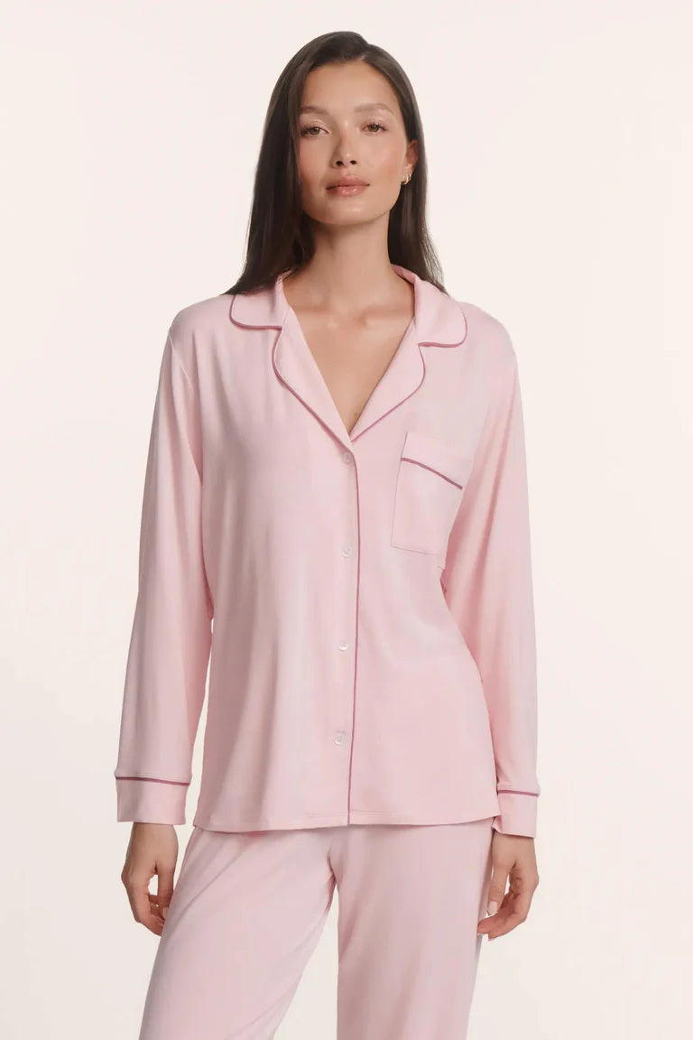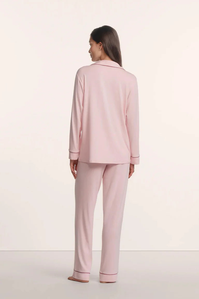 The PJ that started it all. Made from TENCEL™ Modal fibers and a touch of elastane, this buttery soft fabric is verified by OEKO-TEX® Standard 100, meaning it’s dyed with safe and non-toxic dyes. This relaxed long sleeve set features contrast piping, a button-front top with a notch collar and functional pocket, and a low-rise straight leg pant with a thin elastic waistband. Pairs well with our everyday lingerie and blissful ZZZ’s.
