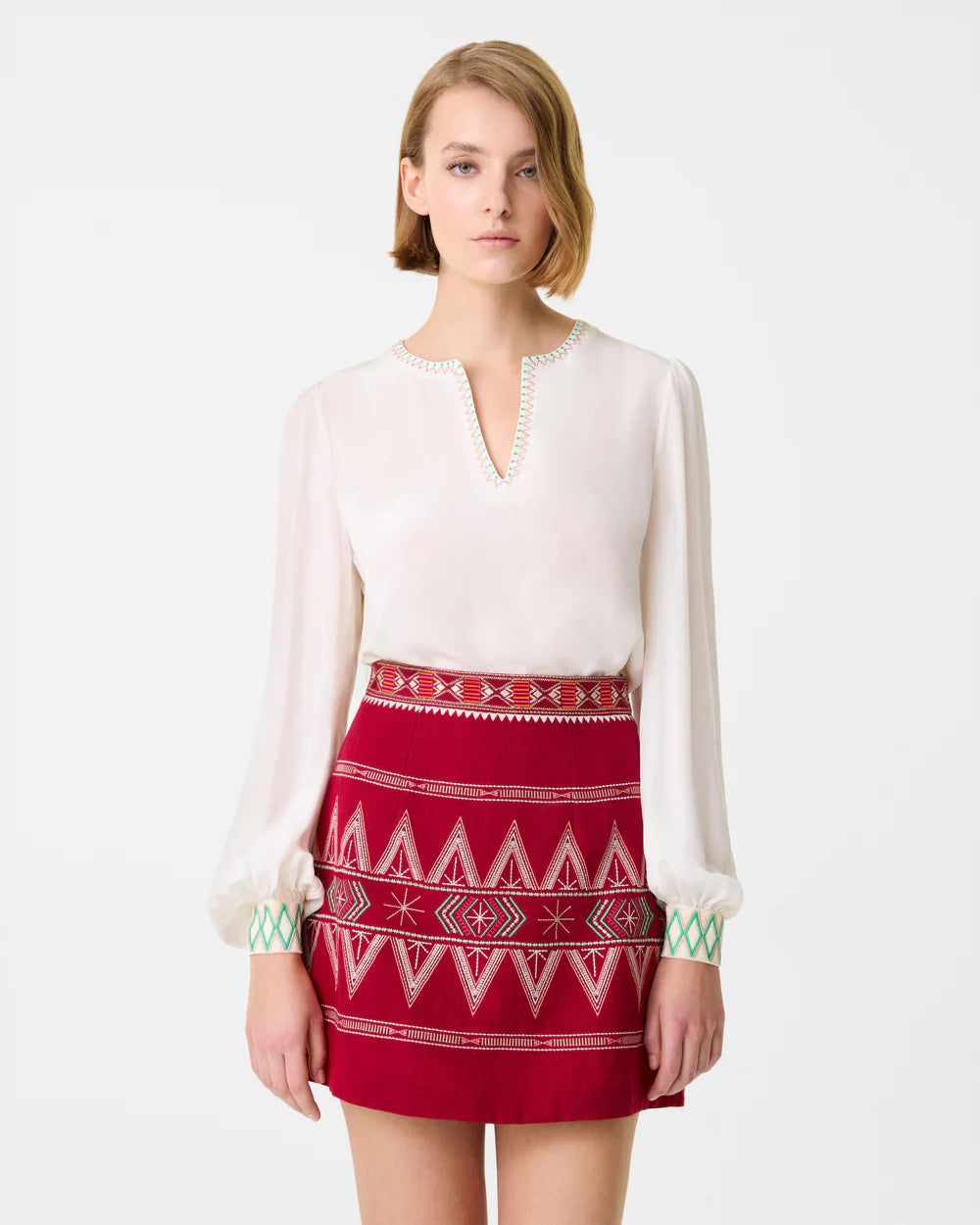 The Giuliana Skirt is a high-rise A-line mini richly detailed with our Ballerina embroidery. Crafted in a linen-cotton blend.