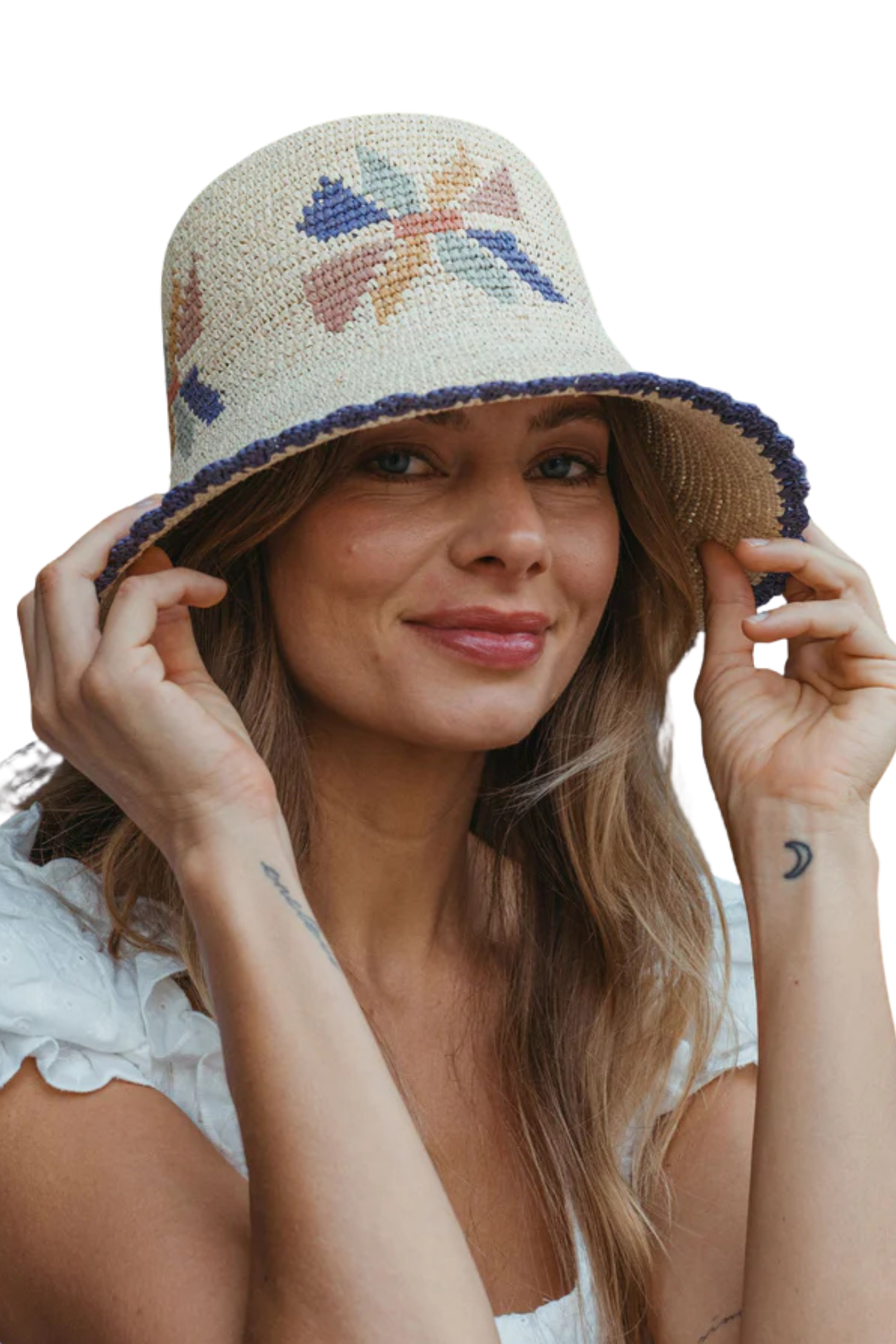 A soft, packable crochet bucket hat with scalloped brim edge and floral geometric pattern.