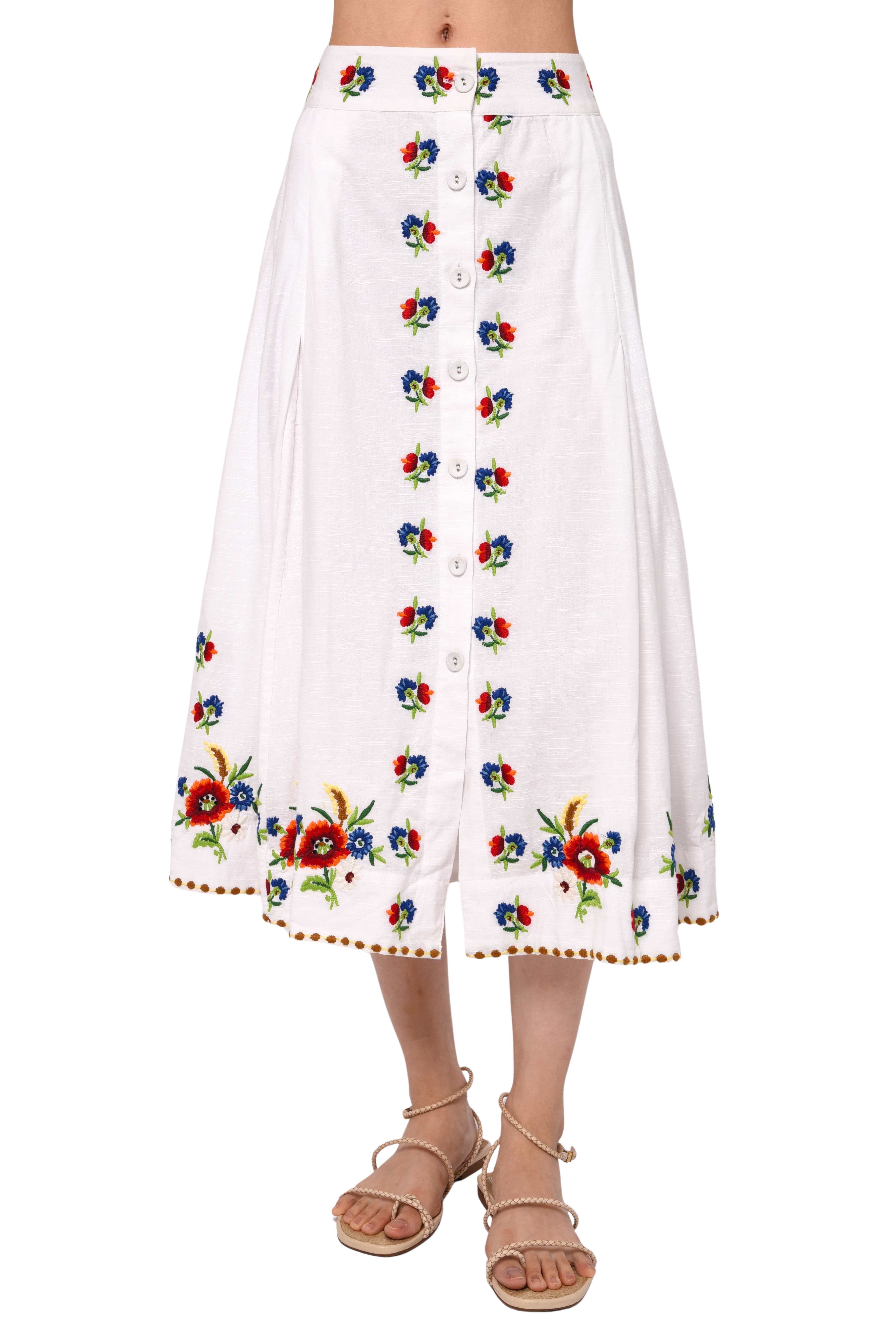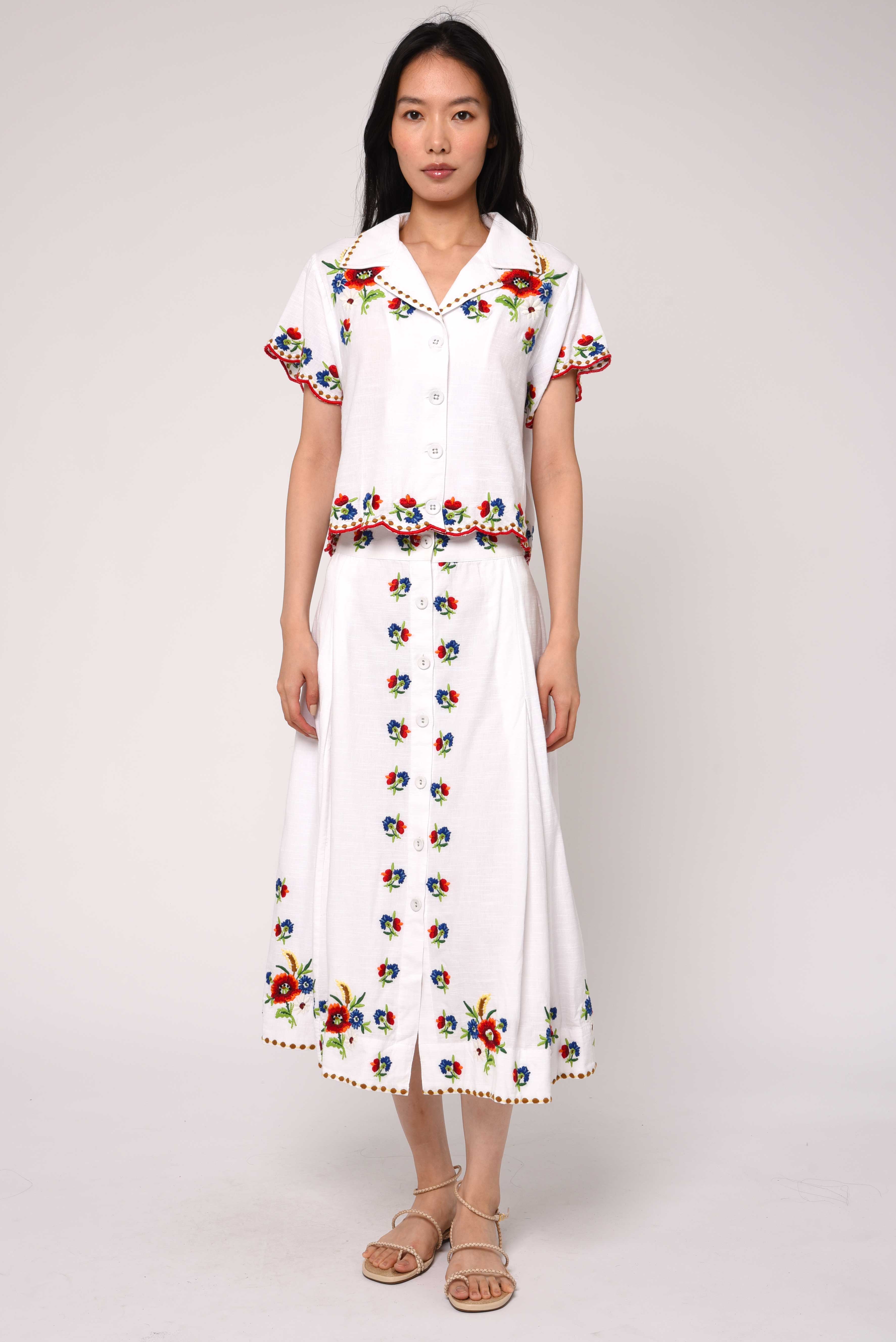 The Berri Midi Skirt is a beautifully crafted A-line piece featuring intricate floral embroidery that mirrors the artisanal detail of the Florinda Top. Designed with a classic button-down front and a high-waisted fit, it creates a sophisticated and cohesive head-to-toe look when paired as a set.