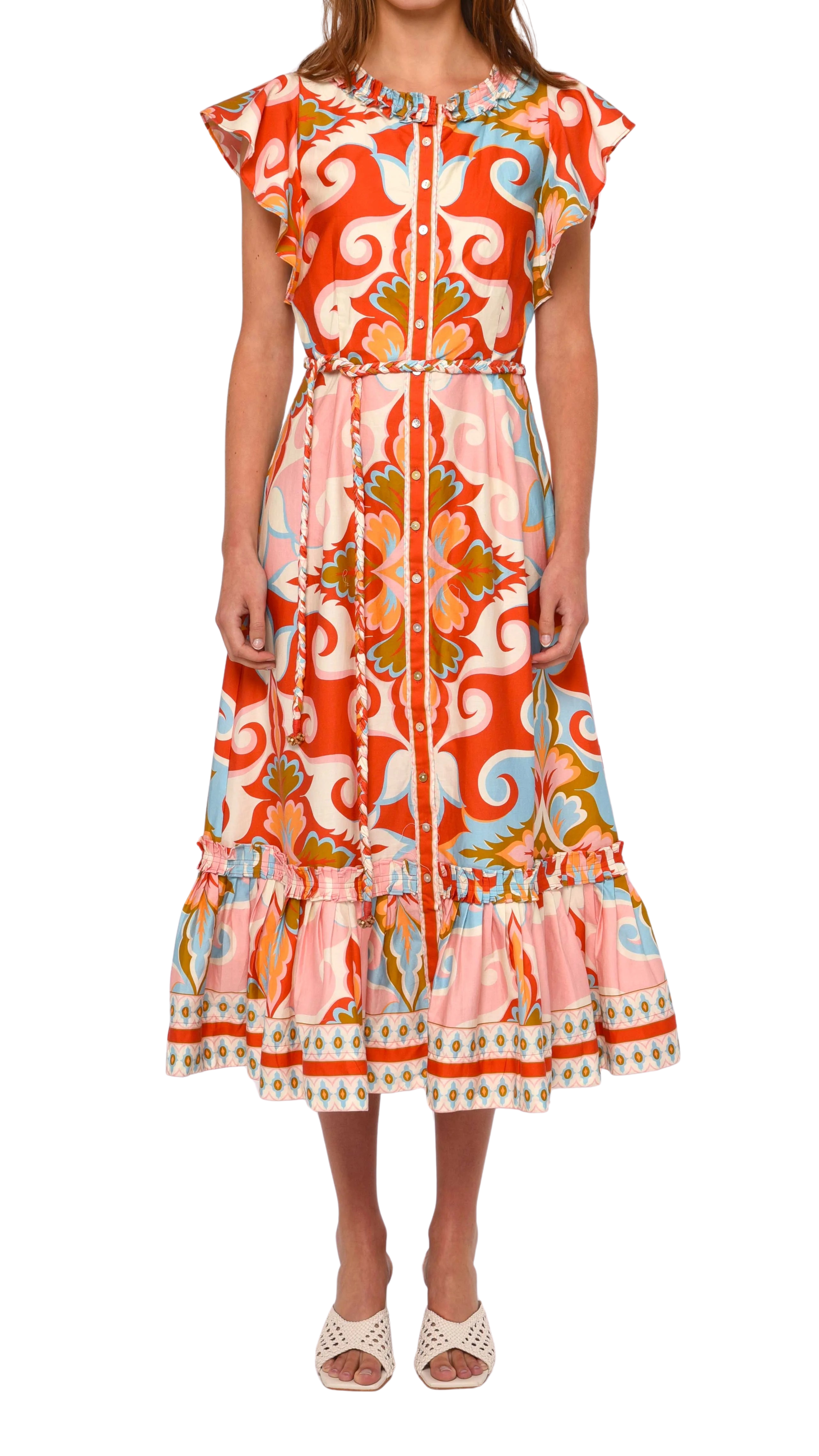 The Ella Midi Dress is a new style designed for Spring 2026. Offered in Cotton Sateen in the Rosette Print, it features a functional button down placket, flutter sleeves, and a beautifully braided front tie. Be sure to make a statement in the Ella Dress.