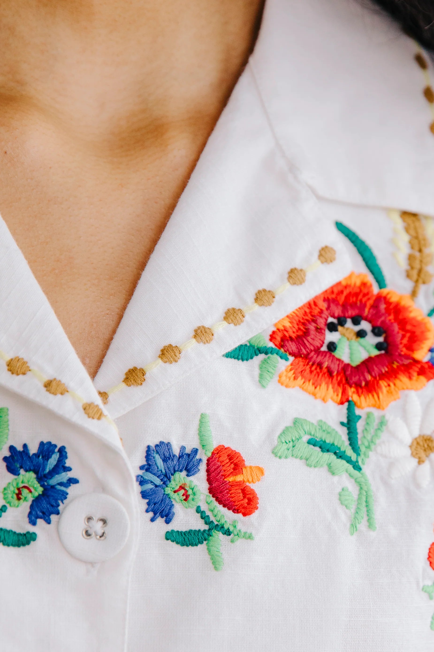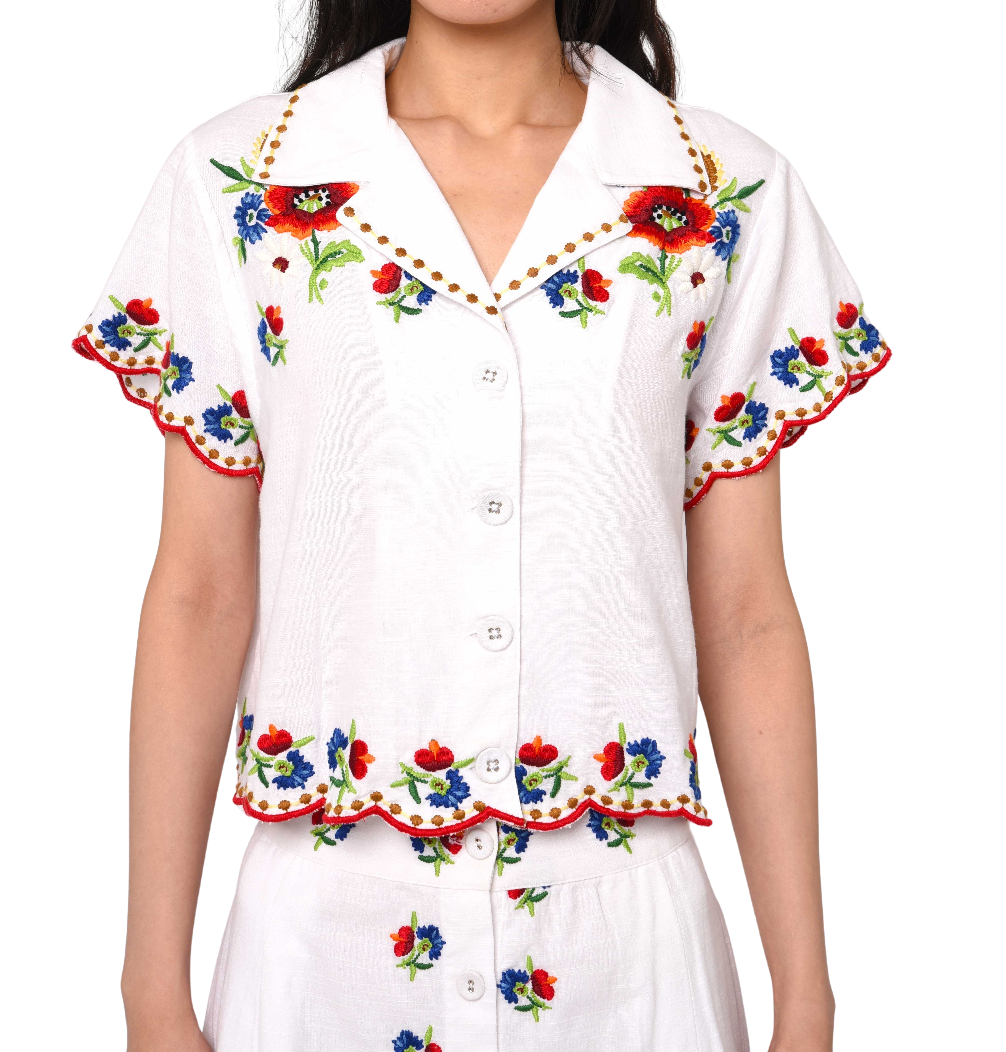The Vera Top is a charming button down blouse featuring vibrant floral embroidery and a classic notched collar. This short-sleeve style creates a perfectly coordinated look when paired with the matching Berri midi skirt.