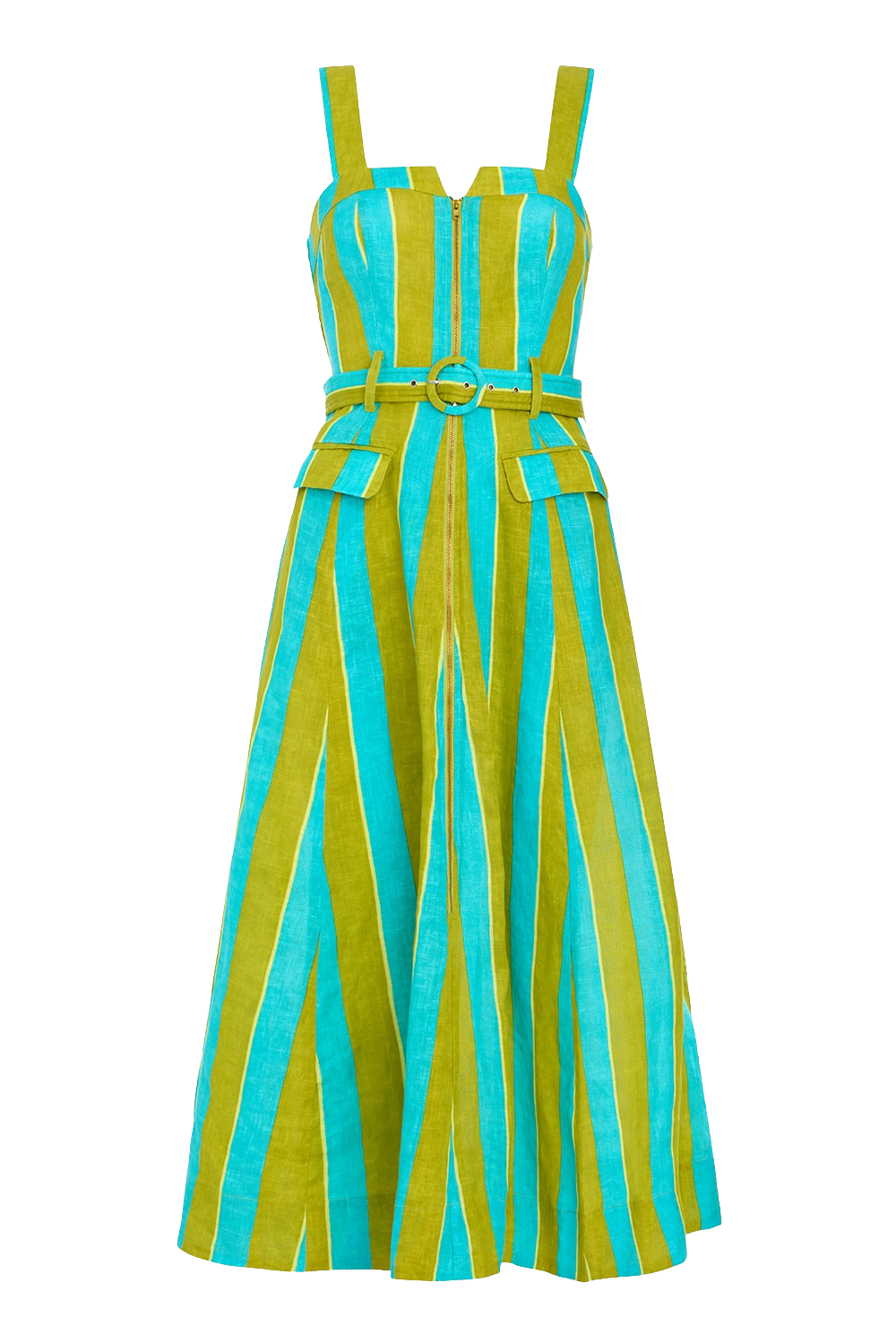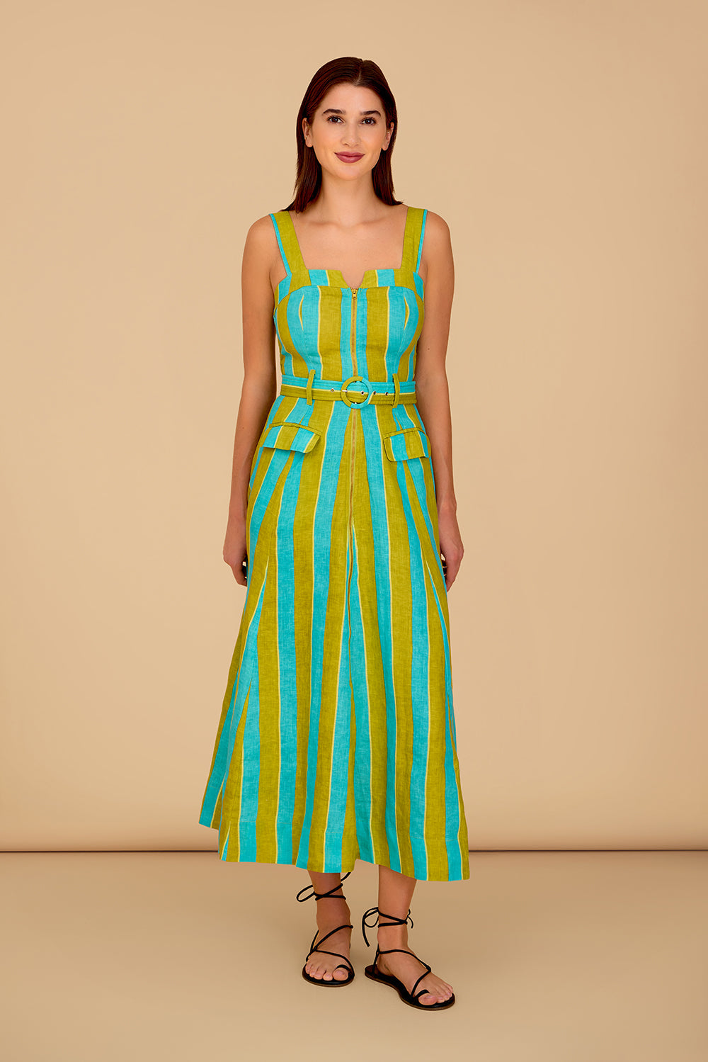 Meet the Foster Dress, a statement piece crafted with thoughtful details throughout. A modern split neckline and adjustable straps with dual button closures add a refined touch, while the front zipper and fabric belt add function and flair. The structured, fitted bodice shapes the figure and is balanced by a full skirt that moves with effortless ease. Polished yet intentional, the Foster Dress is designed to stand out.