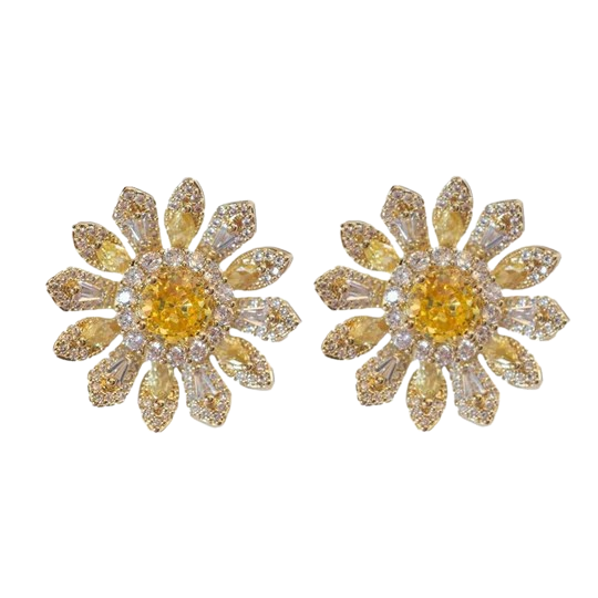 These 1" statement studs feature a radiant citrine-toned crystal center surrounded by shimmering pavé and petal-like faceted stones. Inspired by the warm glow of the Tuscan countryside, their bold floral silhouette feels vintage-inspired yet fresh. Perfect for adding a sunlit pop to summer dresses, linen sets, and resort-ready looks.