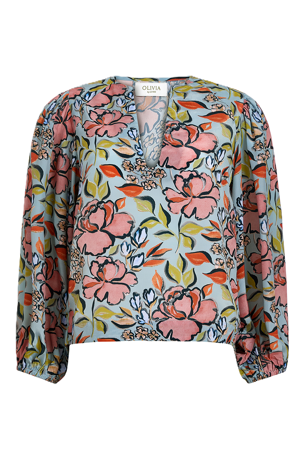 The Effie Top showcases a bold pattern, complemented by a deep V-neckline and gathered long sleeves with elastic cuffs. A refined yet bold piece, ideal for elevating any outfit.