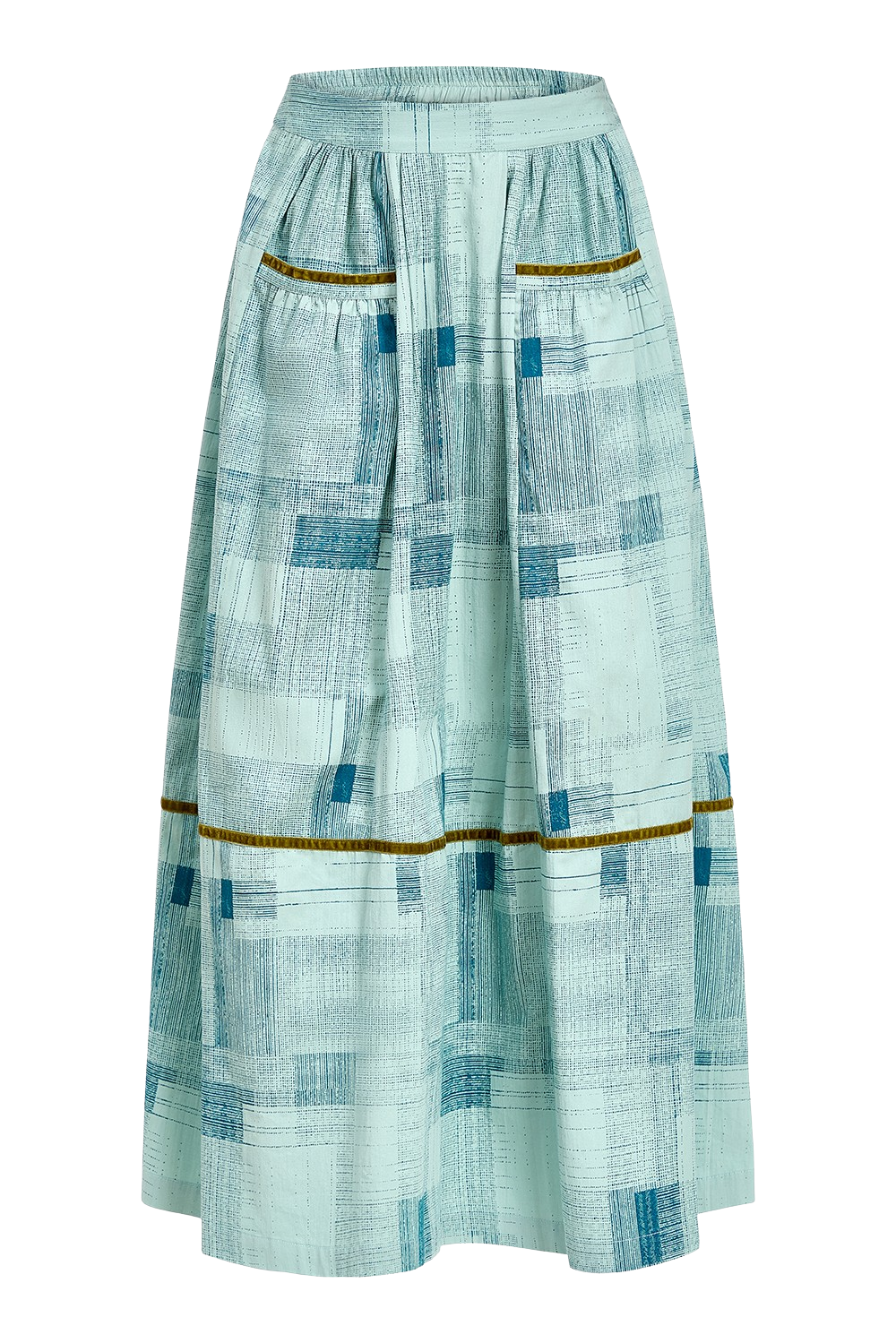 The Gabby Skirt features a flattering midi length with practical front pockets. Its unique design combines a structured set waistband at the front with an elastic waistband at the back, ensuring both a polished look and comfortable fit. The blue print pattern adds a fun textured look, making this skirt a stylish addition to any wardrobe.