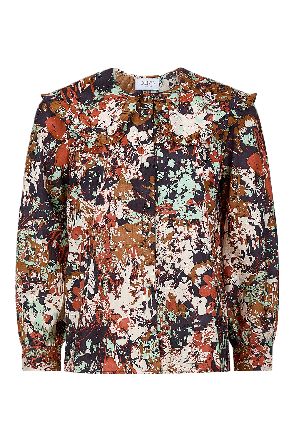 The Liz Shirt features fabric-covered buttons down the front, adding a refined touch to its design. Its Peter Pan collar is enhanced with a delicate ruffled hem, offering a playful yet sophisticated detail. The button cuffs provide a tailored finish, keeping the top polished yet lively.