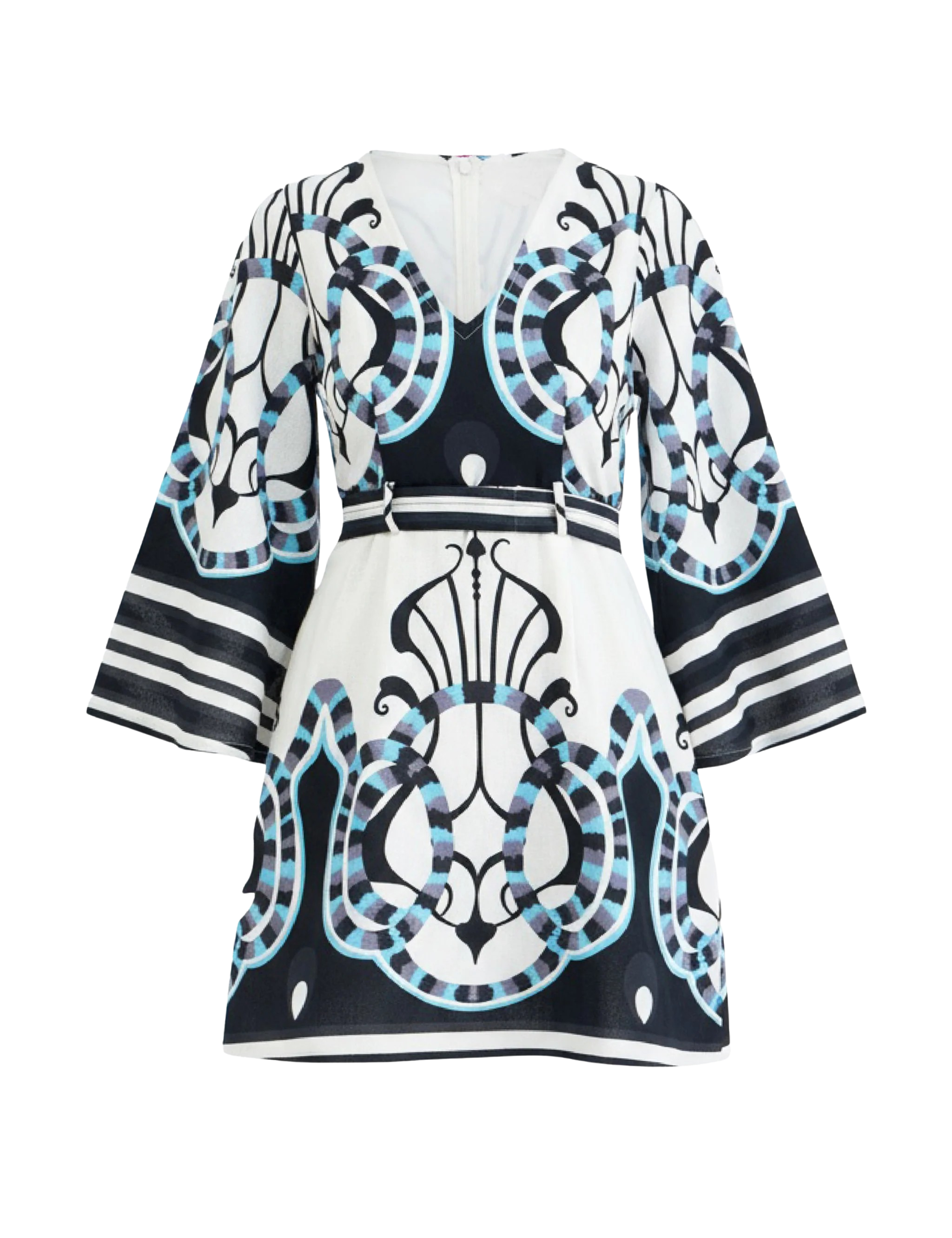 Say hello to Kennedy, a chic mini dress that strikes the perfect balance between structure and ease. Designed with a flattering V-neckline, it features a semi-fitted waist that can be cinched with the attached belt. The slight A-line skirt adds effortless movement, while cropped bell sleeves bring a touch of playful elegance.