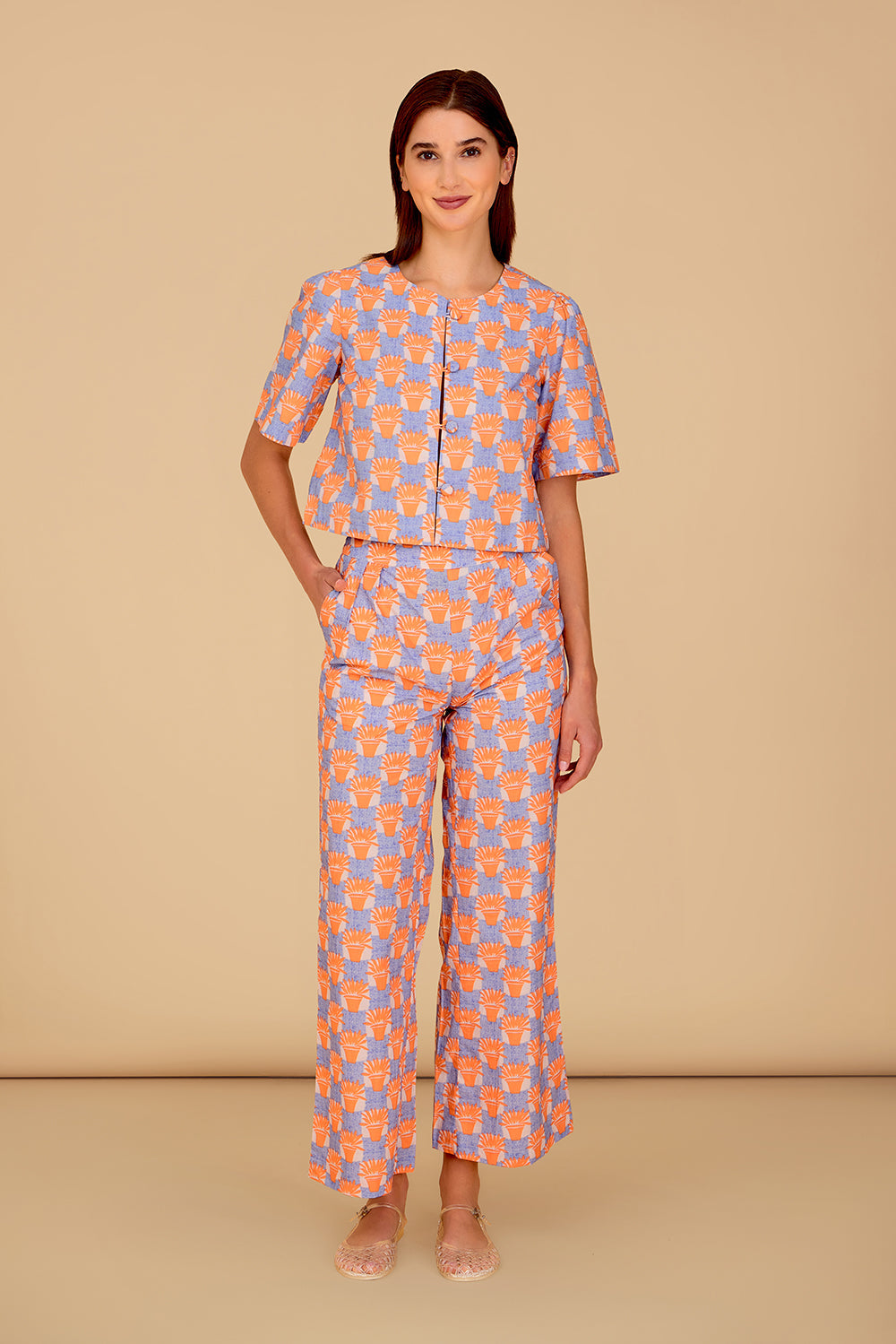 New this spring, the Zuri Pants are a bold yet comfortable option. The hidden side zipper, slight crop, and straight leg keep it classic, while the earthy palette and allover print adds a grounded, sun-kissed feel. Perfect for sun-soaked afternoons and breezy evenings.
