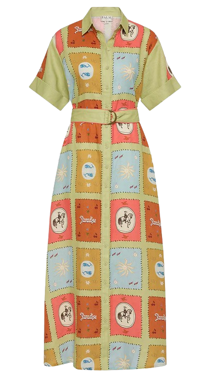 The Maya Tile Dress is crafted from a premium linen. The Maya Tile Dress is designed as a relaxed fit, featuring cuffed sleeves, centre front button detailing, contrast piping and a point collar. Style with an adjustable waist tie with d-ring to create a relaxed yet elevated look. Please refer to our size and fit guide for further fit details.