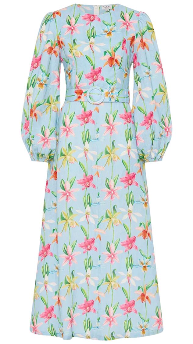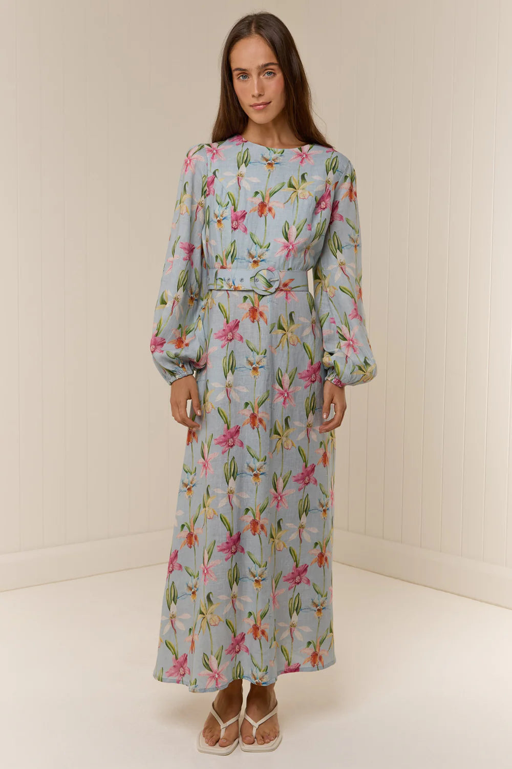 The Melrose Dress, printed in our exclusive Colourful Orchid print, is crafted from a premium Linen. Fitted through the bust and waist and flowing in to an A-Line Skirt, the Melrose Dress is designed to softly skim the body for a flattering fit. Featuring a rounded high neckline, blouson sleeves, matching buckle belt and an ankle length hem.