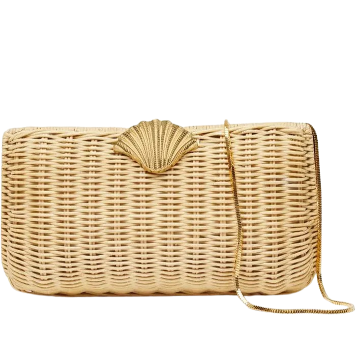 The Classica Clutch offers a sleek and minimalistic silhouette featuring a custom, gold plated scallop shell embellishment. The optional chain strap allows you to alternate wearing this style as a clutch or shoulder bag.