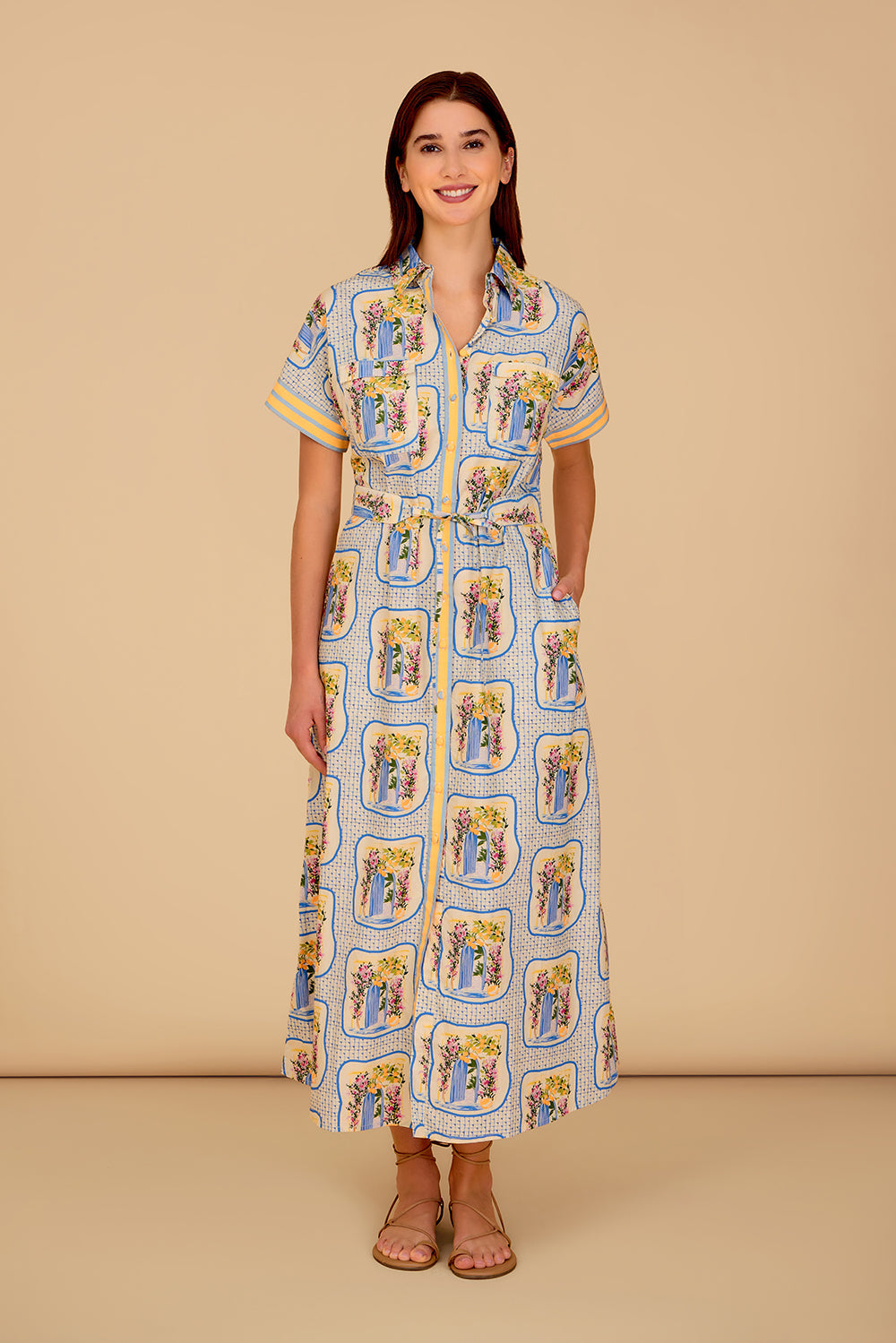 The Daphne Dress is an effortless statement piece designed for sun drenched days and easy entertaining. Featuring a tailored shirt dress silhouette with a full button front and removable waist tie, Daphne flatters with structure while still feeling relaxed and breathable. Short sleeves, a classic collar, and a flowing midi length make this style endlessly versatile. Wear it cinched for a defined shape or loose for an easy, breezy feel. Pair with sandals for daytime or elevate with wedges for dinner al fresco.