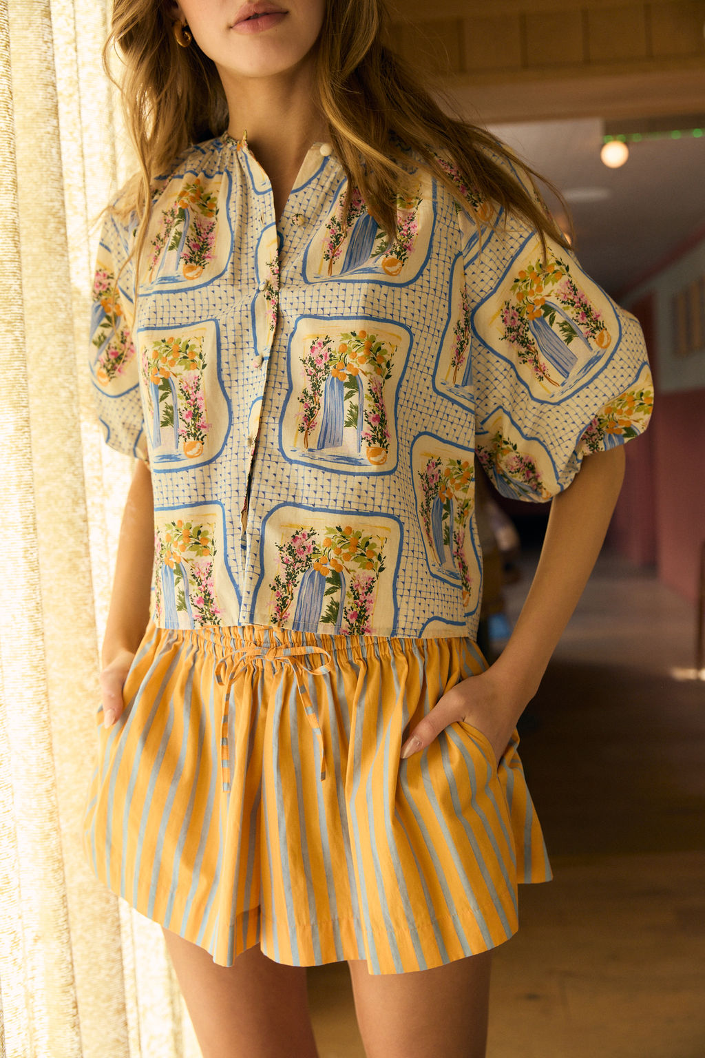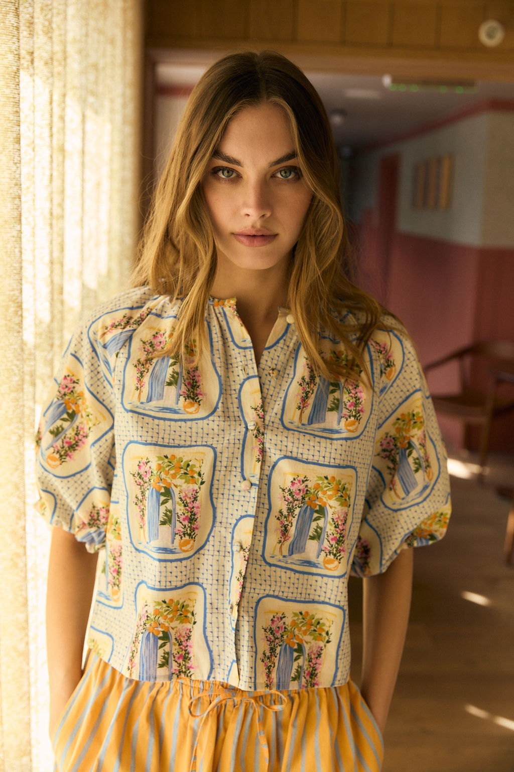 An easygoing silhouette with statement appeal, the Freda Top features a relaxed fit, open collar neckline, and voluminous short sleeves. Pair it with matching separates or denim for a pulled-together, effortless look.