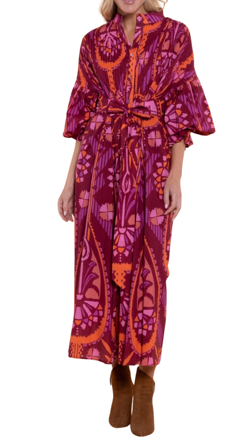Every body is beautiful. Introducing The Every Body Dress, the perfect addition to your wardrobe. Designed as an innovative one size fits most style, making it perfect for a broad variety of body types, this dress offers effortless appeal and comfort. Made from light and airy cotton voile, it features a full gathered sleeve, button front, an attached, adjustable belt and a flowy skirt for a chic and sophisticated look. Elevate your style with this elegant and comfortable wardrobe addition.