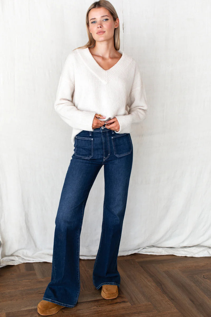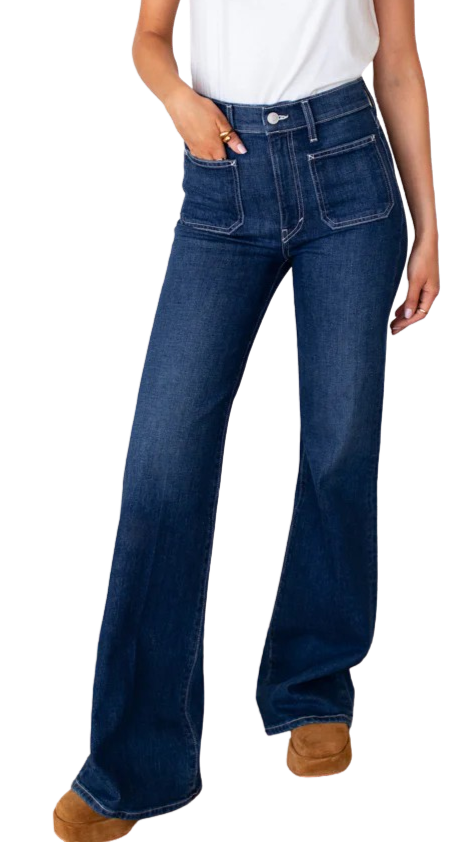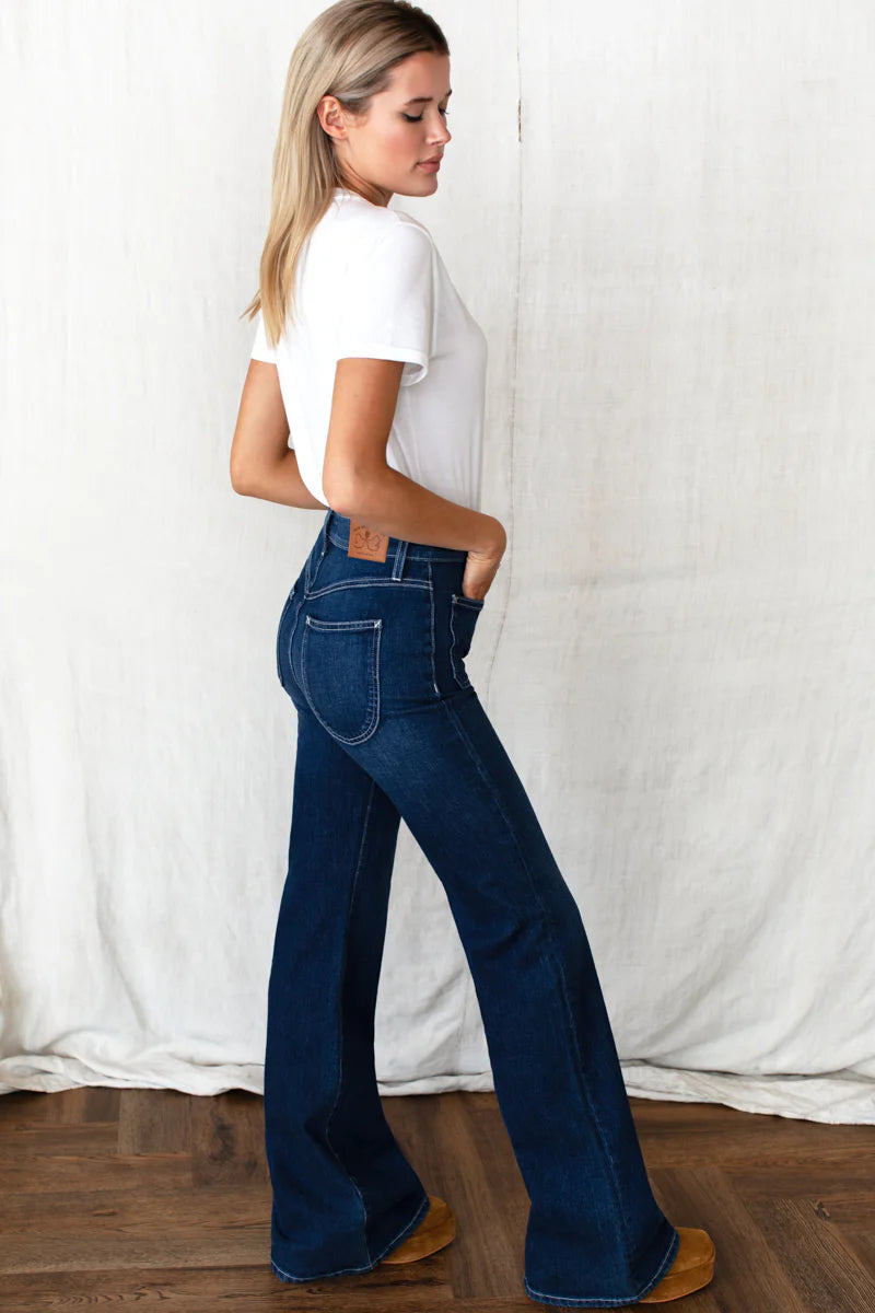 The Treasure Bell jean puts a new twist on an iconic 1970's silhouette made modern through fit and fabric, offered in a premium Italian stretch denim. This high rise retro inspired fit sits high at the waist, slim through the hip and straight with an elongating bell-shaped leg. Has two topstitched front pockets. The magical back rise, yoke seams and signature back pockets are shaped to be a focal point in this fit, creating the perfect "backseat" on anyone. It’s a perfect wear everywhere with anything style.