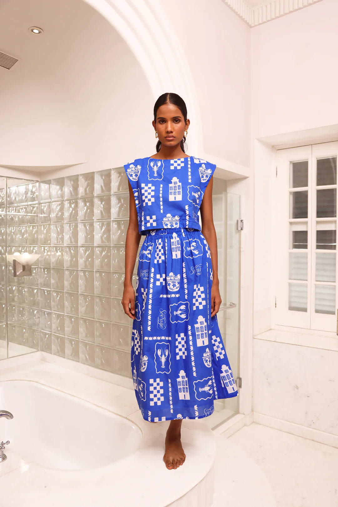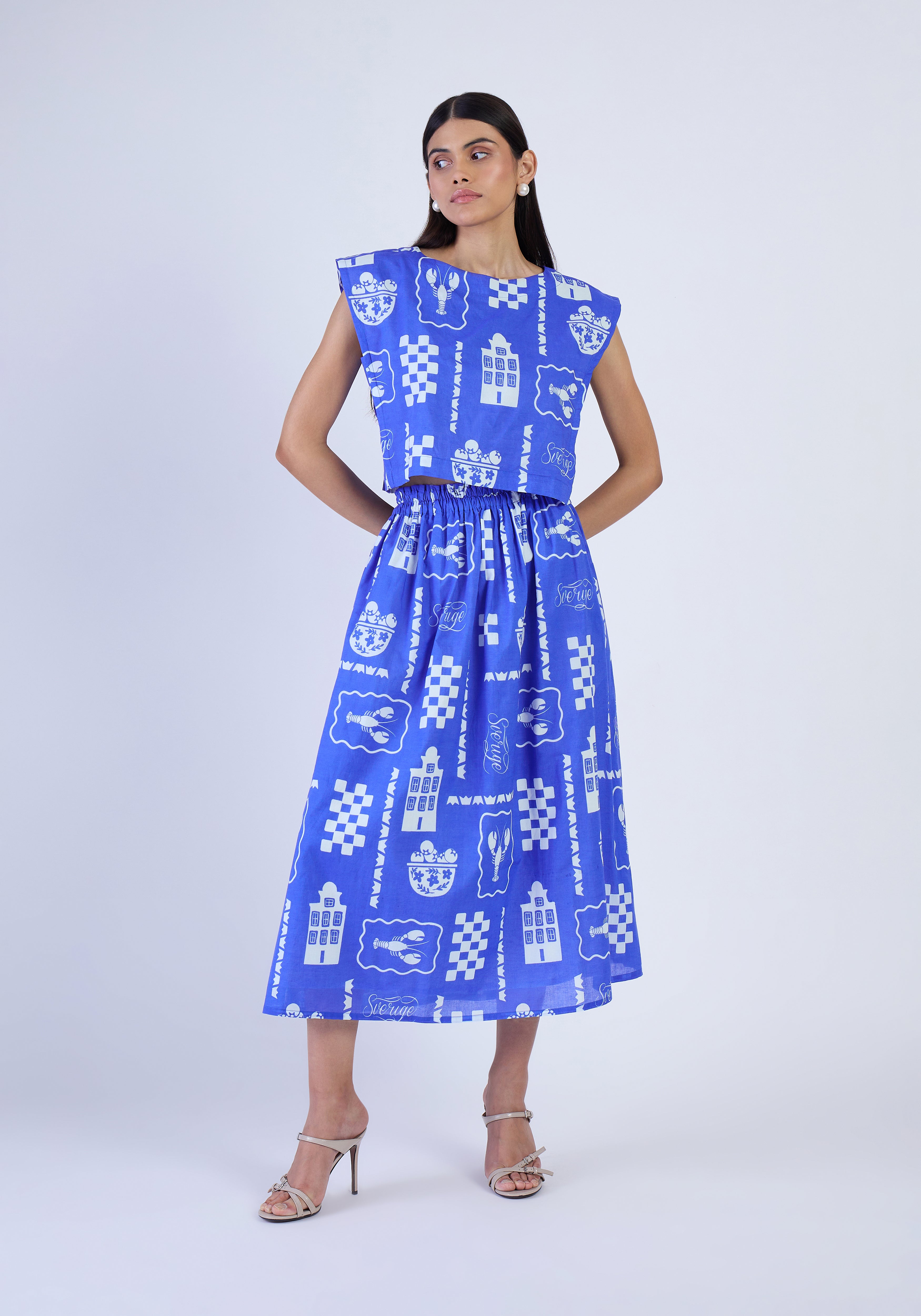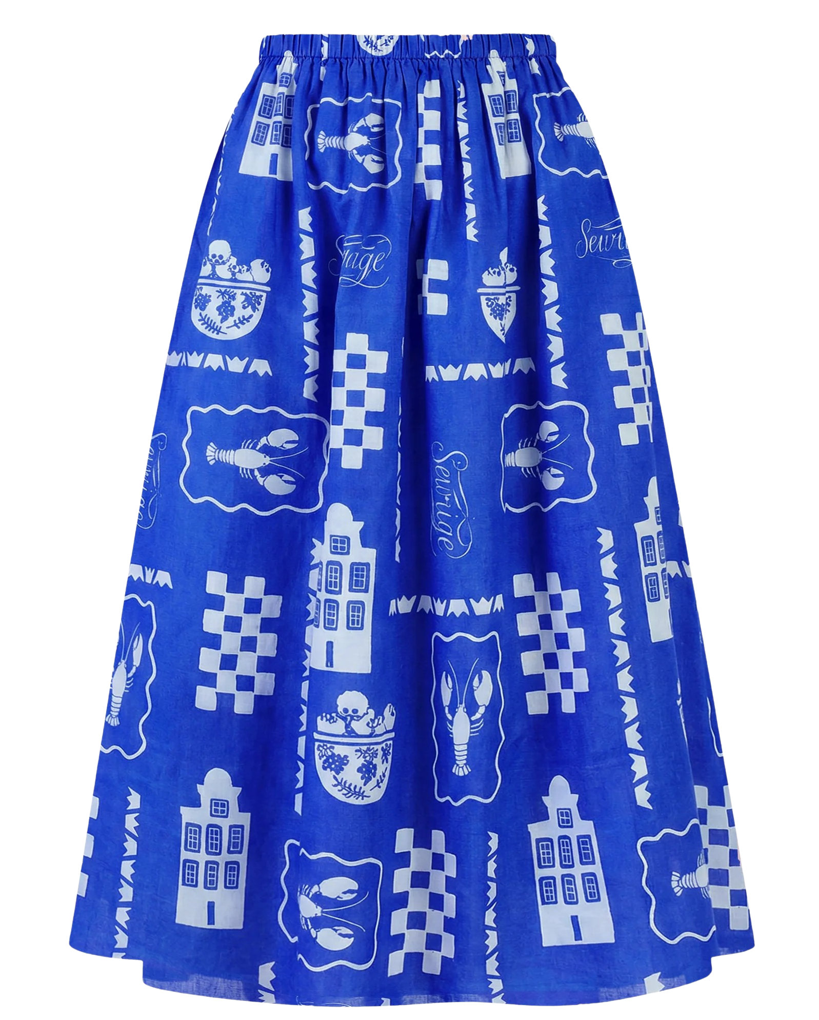 Amber is a midi skirt with a flattering A-line silhouette, hidden pockets, and offers exceptional comfort at the waist thanks to its elastic waistband. Pair it with flats for a casual daytime look, or dress it up with heels. Amber is made from airy cotton voile soft, breathable, and effortlessly breezy. A striking blue against clean white, this print captures the cool clarity of a Swedish summer. Inspired by sailing through the archipelago past pine-fringed shores and painted wooden homes it evokes the quiet thrill of escape in the north.
