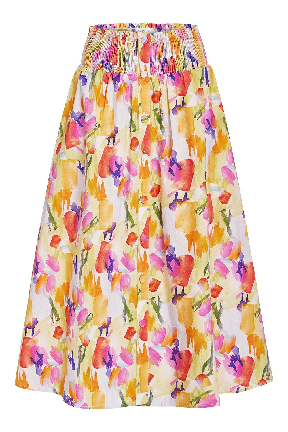 The Georgia Skirt offers a timeless, feminine look with its breezy A-line shape, comfortable smocked waistband, and scalloped hem. Covered buttons trail down the front for a polished finish, while the bright pattern adds texture and charm.
