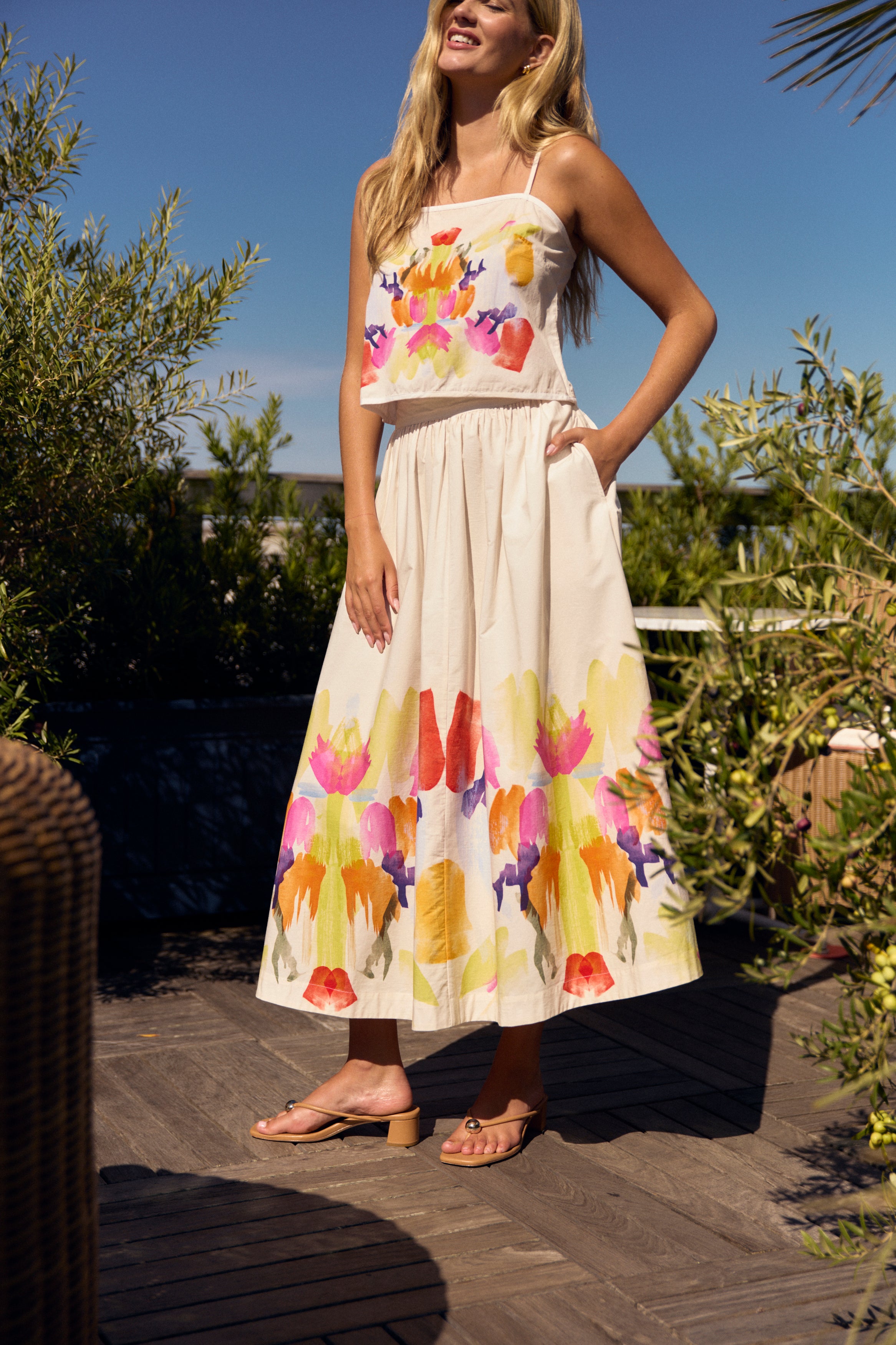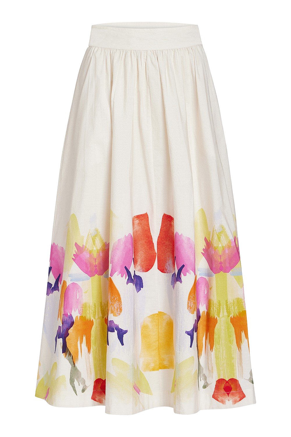 The Kit Skirt blends ease and charm with its flattering high waist. Designed with a full, flowy silhouette and soft gathering at the waistband, it moves beautifully and pairs effortlessly with both elevated tops and simple tees.
