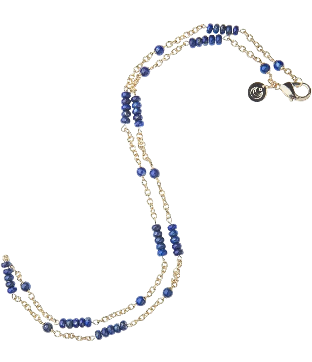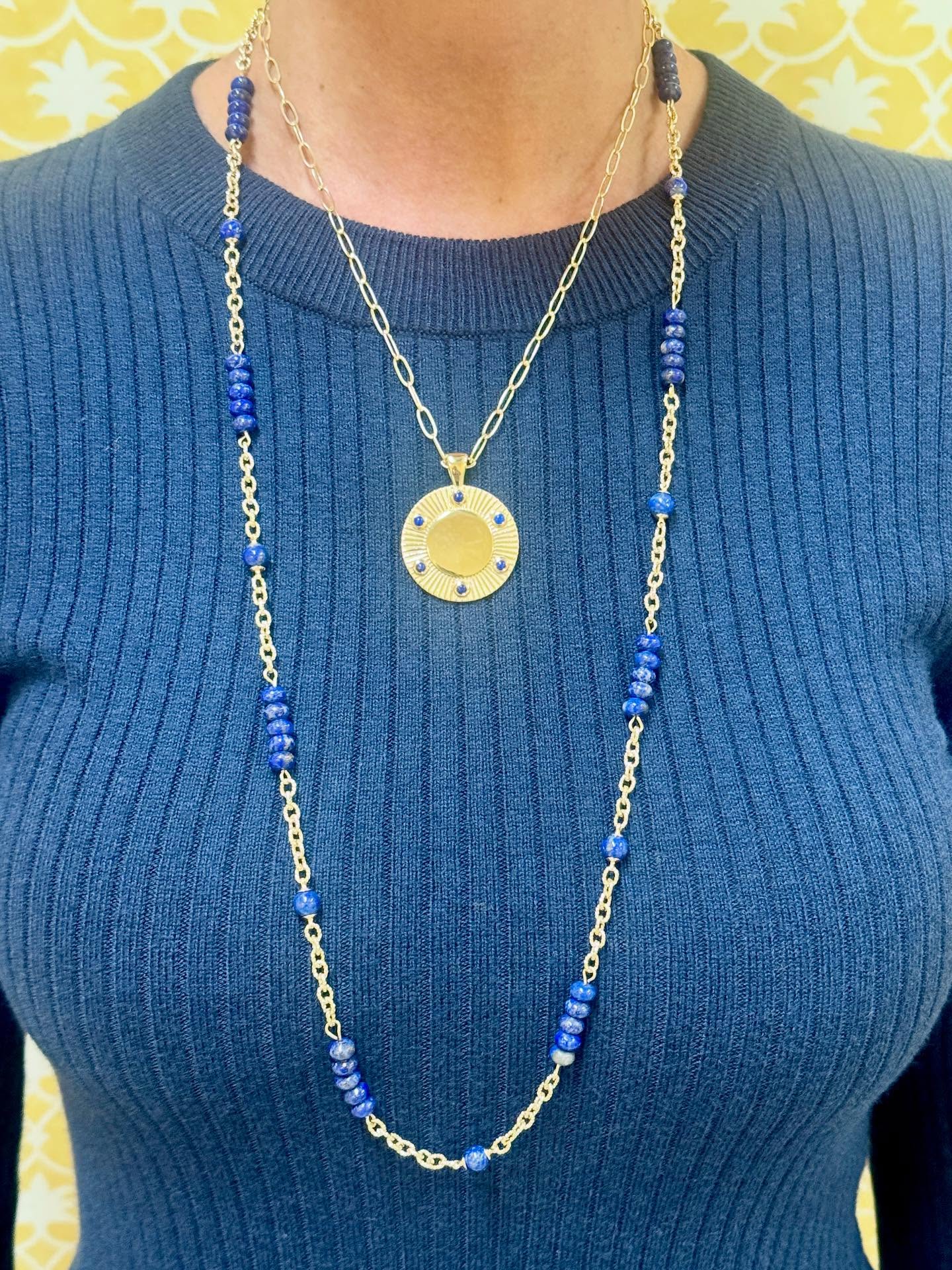 If you are like us, you loved digging through your grandmother's jewelry box, and there was sure to be strands of bead in there there. Inspired by those moments, this textured chain necklace is accented with carved lapis beads. Wear it long or double wrap it for a shorter look, you can either top off your neck-mess with this chain or attach your Jane Win pendant to the clasp.
