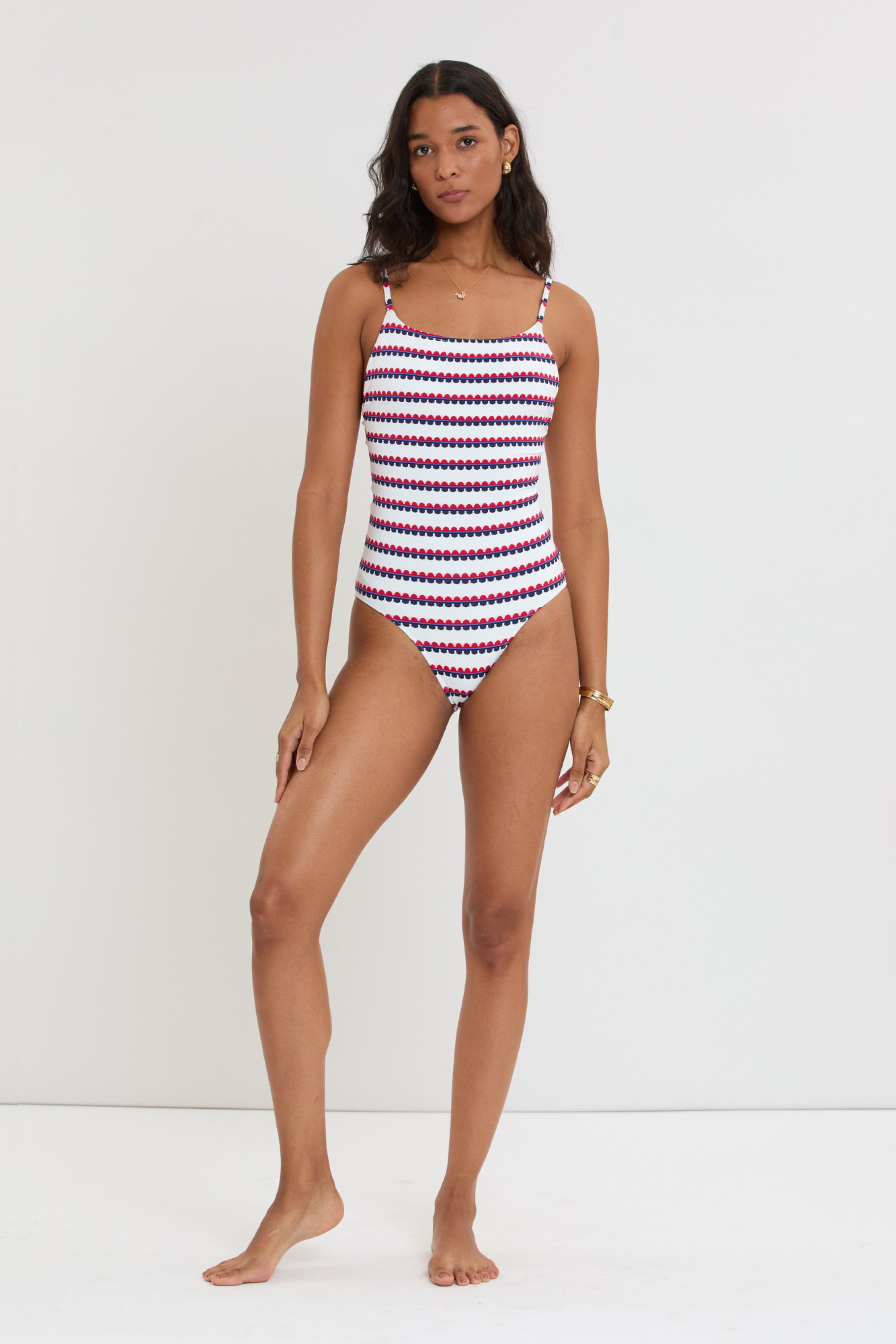 The fully lined classic one piece features a wide scoop neckline, adjustable spaghetti straps and a low back. The interior shelf bra with removable pads allows for the perfect fit for all shapes and cup sizes.