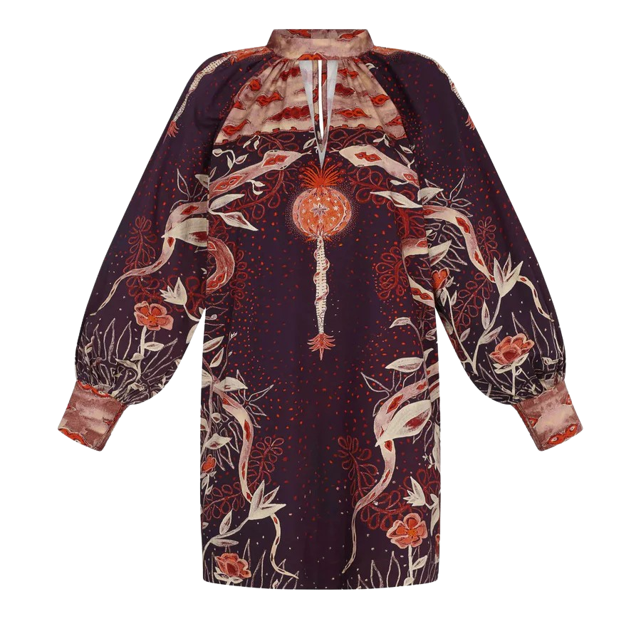 - Long-sleeved mini dress with a mandarin collar and gathered neckline