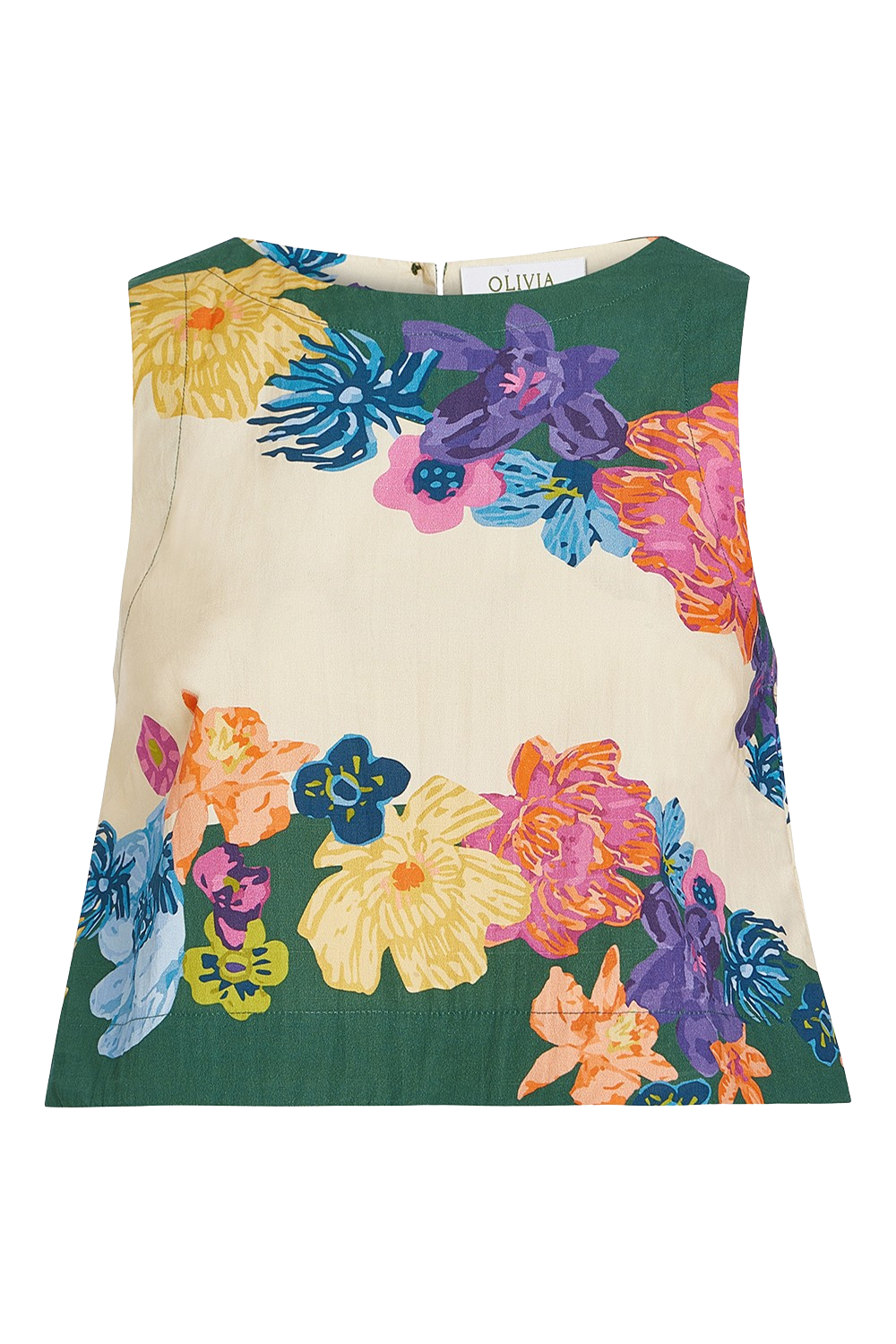 The Dani top is a sleeveless, cropped silhouette with a clean, structured shape that drapes effortlessly. The high neckline keeps it polished, while the slightly boxy fit creates a modern, effortless look. Pair with the Kit Skirt in Floral Fete for a vibrant matching set.